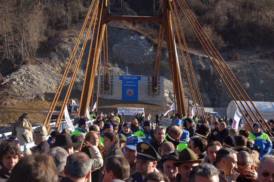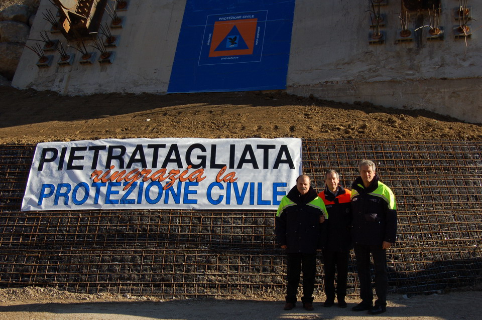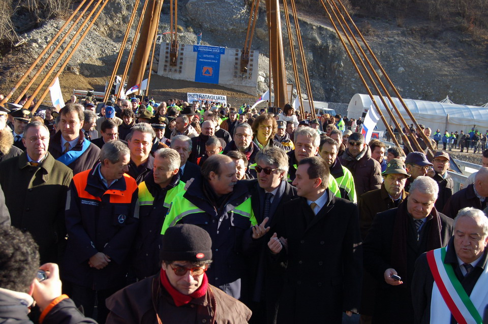 Se si osservava attentamente Guido Bertolaso, si vedeva che era contento ed infatti ha condiviso con i presenti i motivi della sua contentezza: “La mia soddisfazione è legata proprio a questo ponte bailey che da oggi iniziamo a smontare, perché questo ponte ha già una sua destinazione. Una destinazione molto precisa, che simbolicamente che lo porterà in Sudan in un territorio tra i più martoriati dell’Africa con gente poverissima che ci vive. In Sudan c’è un fiume che divide a metà un territorio vasto tre volte l’Italia e che rendeva difficile il semplice vivere quotidiano. Abbiamo preso un ponte gemello a quello di Pietratagliata, lo abbiamo trasportato via nave, caricato nei camion e costruito laggiù in Sudan per collegare queste due parti di terra. Ora la gente non sì dà più appuntamento al fiume per sopravvivere: ora lo attraversa camminando, con i camion e con i vari mezzi che adesso possono transitare. A quelle persone abbiamo raccontato la storia di questo ponte di Pietratagliata, la disperazione e il dolore vissuto dalla sua popolazione dopo l’alluvione, Ma abbiamo anche raccontato la speranza e la soddisfazione della gente di Pietratagliata quando è stato costruito il ponte Bailey. La stessa gioia e la stessa felicità che oggi leggiamo negli occhi di quella povera gente, sono le immagini che ancor di più da oggi con questa inaugurazione potremo dare a tutto il mondo come dimostrazione di questa italianità, di questa genialità, di questa fantasia, di questa passione del nostro paese che è davvero unica in  tutto il mondo.