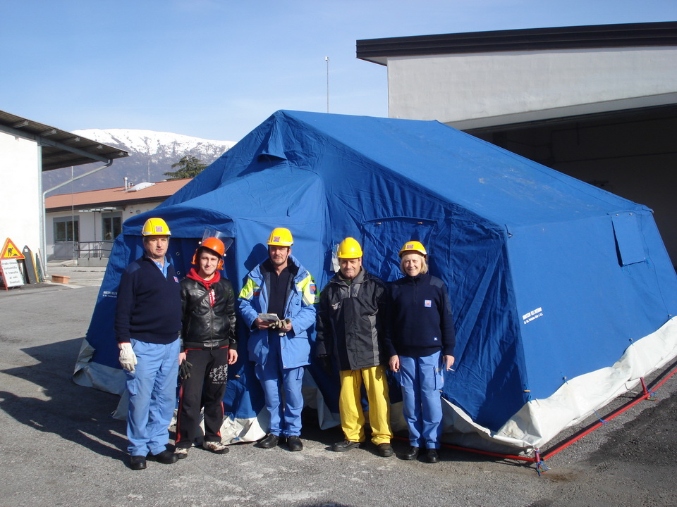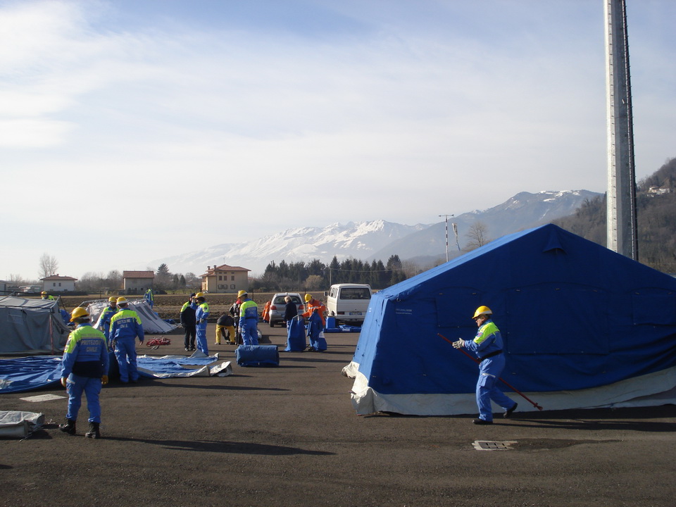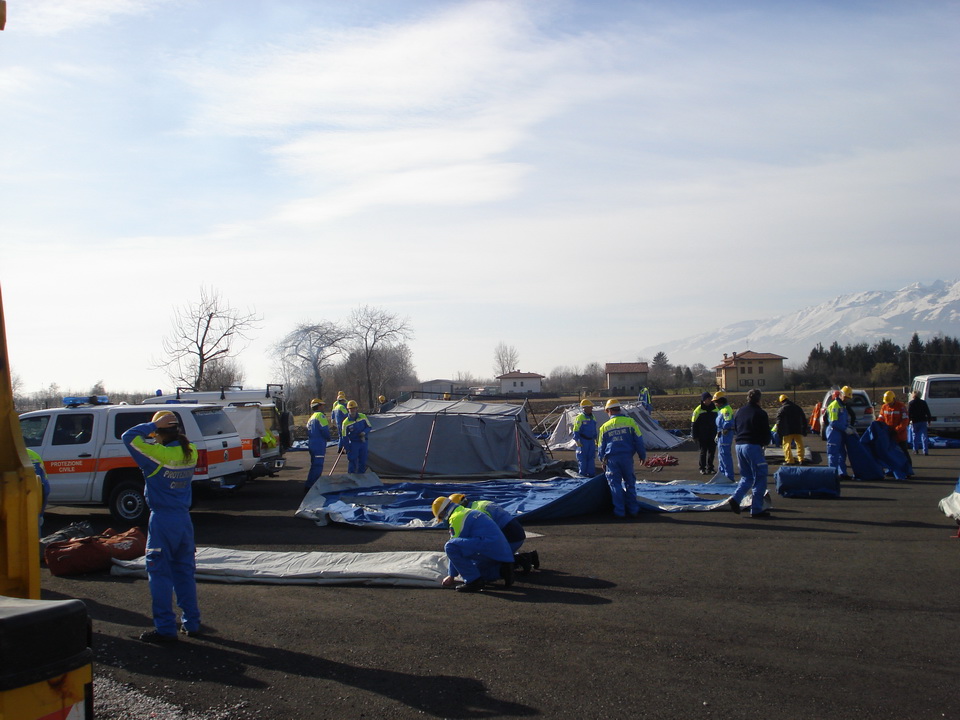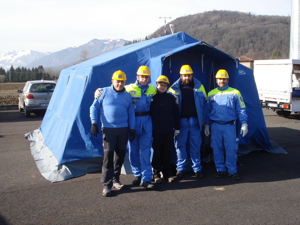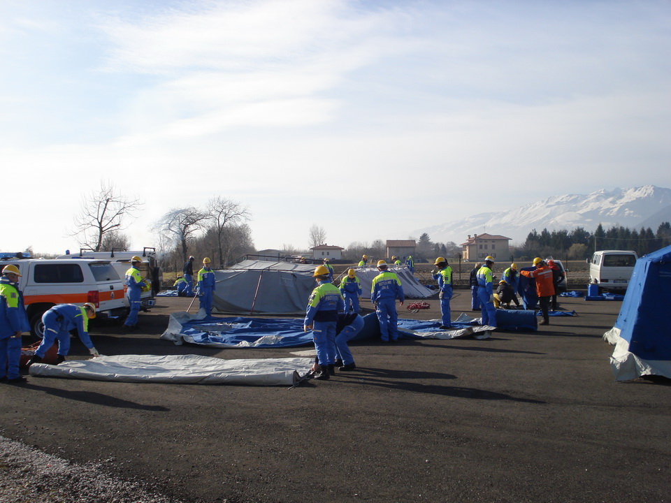 Nella giornata di domenica, oltre ad una prova di progettazione di una ipotetica piccola tendopoli, i volontari, suddivisi in gruppi, hanno effettuato il montaggio e lo smontaggio delle tende, Ferrino 19 e P.I. 88, in dotazione alla Protezione Civile regionale.