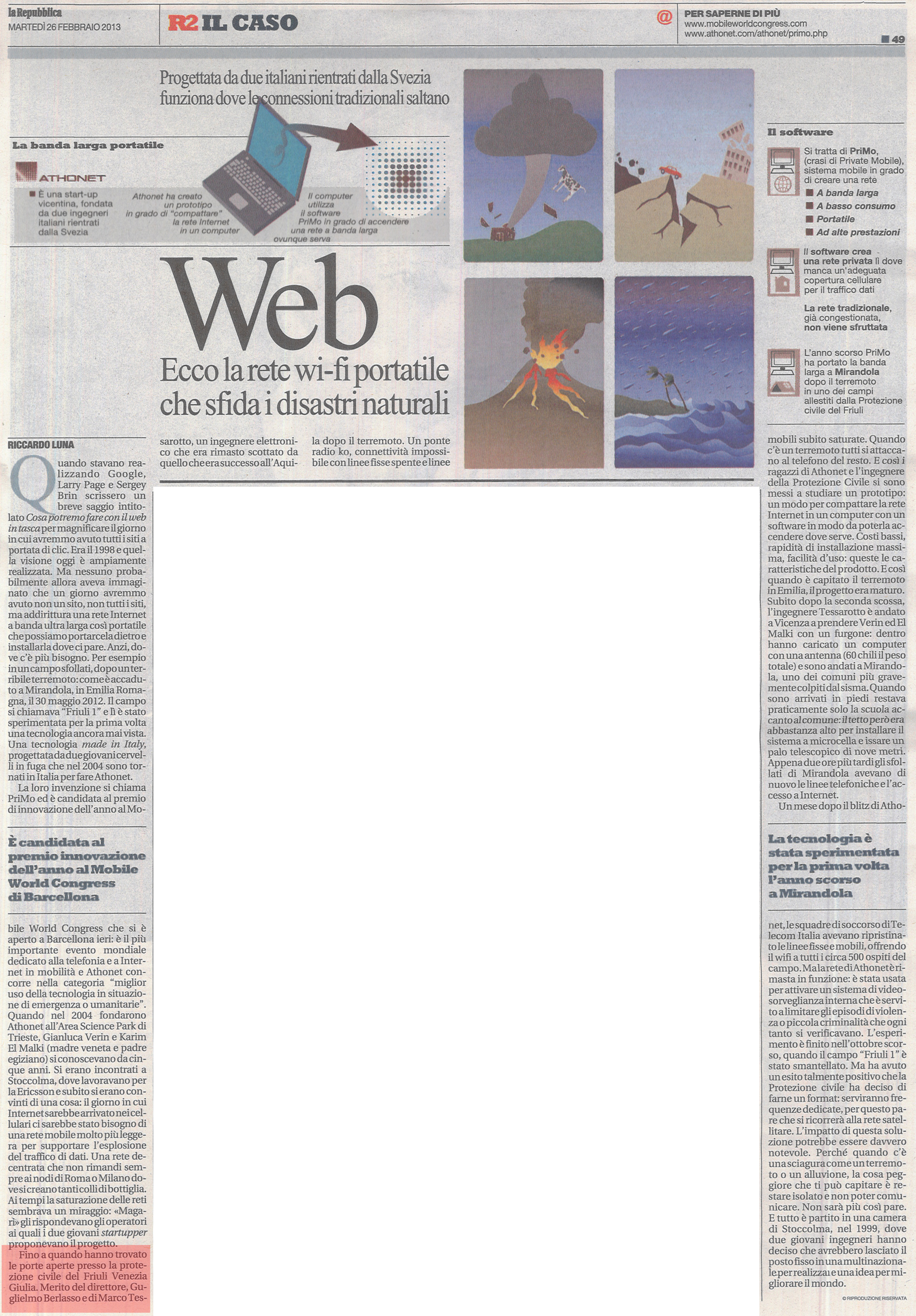 Martedì 26 febbraio 2013 è stato pubblicato sul quotidiano nazionale “La Repubblica”, a firma di Riccardo Luna, l’articolo dal titolo “Ecco la rete wi-fi portatile che sfida i disastri naturali”.