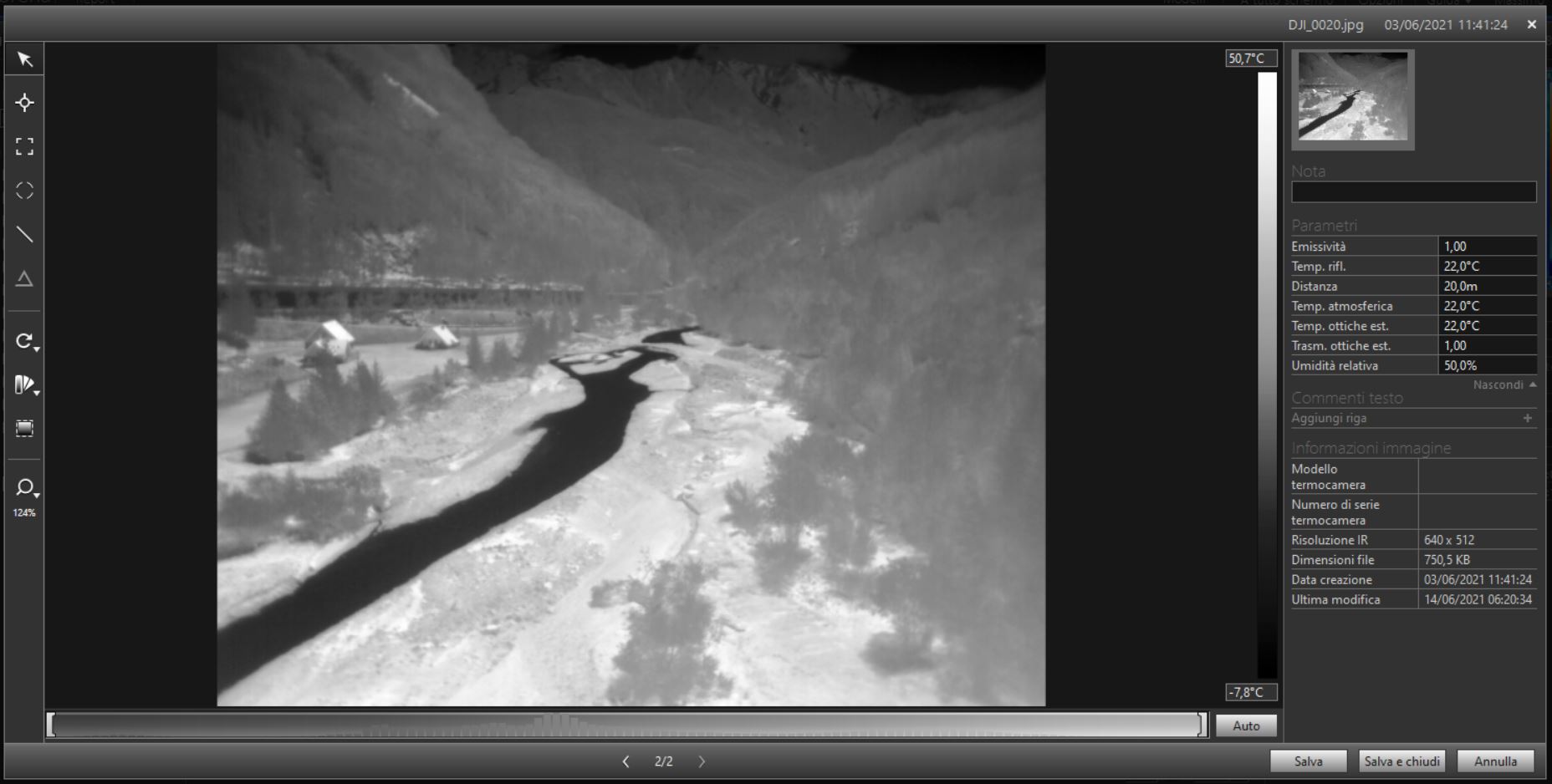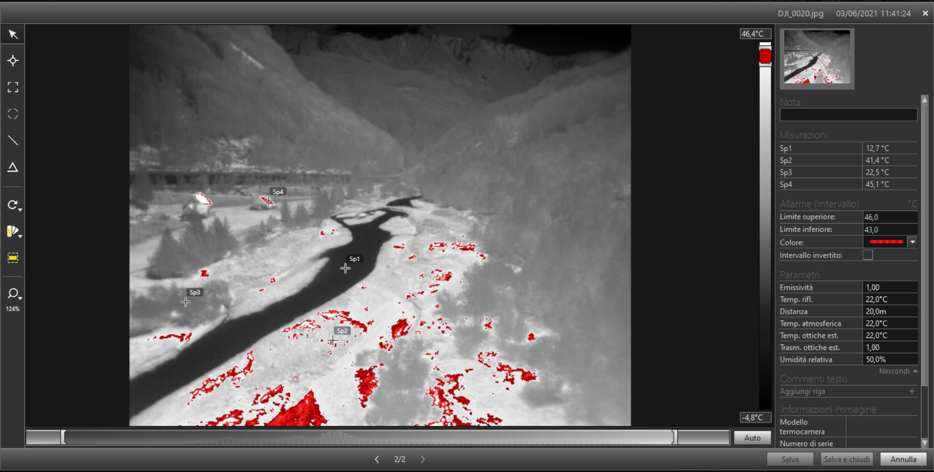 Per tale attività è stato impiegato il Sistema UAV Matrice DJI 210 in dotazione all’Unità SAPR, dotato di doppia sensoristica (fotocamera RBG + Termocamera Radiometrica).
