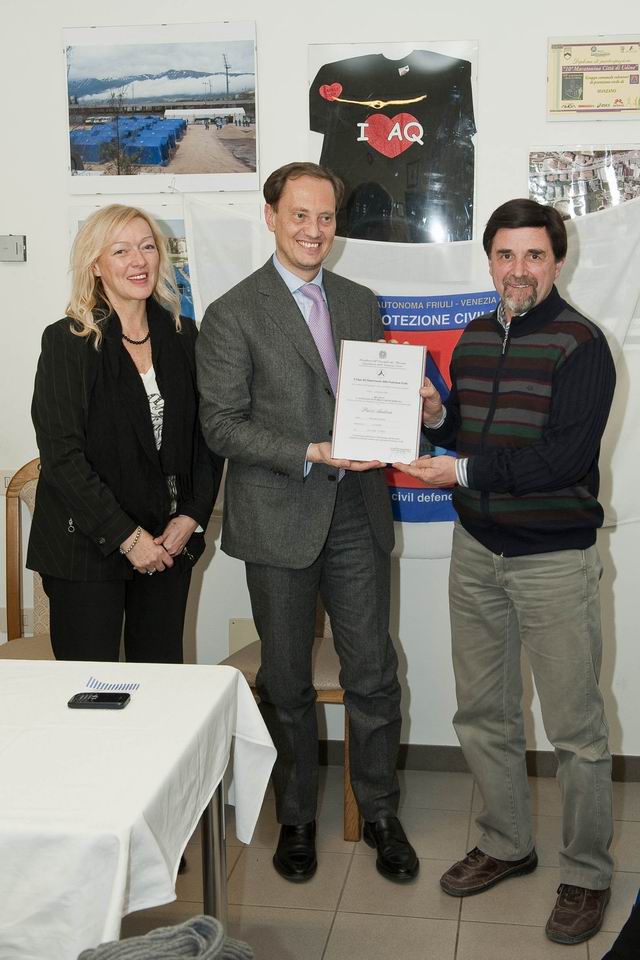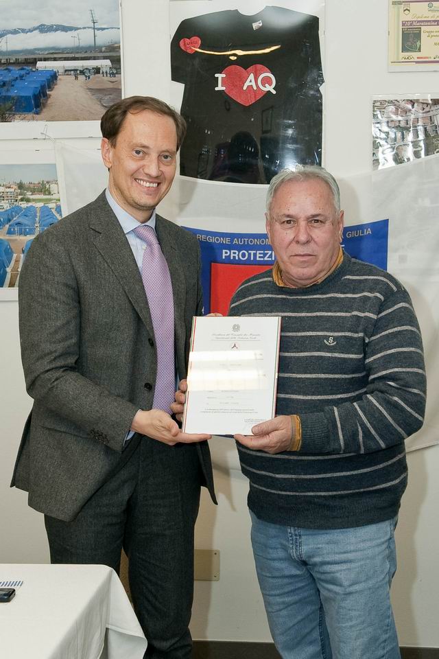 Hanno quindi ricevuto direttamente dalle mani dell’Assessore Ciriani l’attestato di Pubblica Benemerenza di Terza Classe – Prima Fascia, i volontari: Bon Giorgio, Scheveneels Alain, Fracassa Angelo, De Sabbata Alessio, Pirisi Andrea, Pitassi Patrick, Bortolussi Lucio, Caissutti Daniele, Cicuttin Paolo, Moratto Maurizio, Talotti Luigi, Ricchiari Pietro, Del Bon Milvia, i Capi Squadra Antoniello Donato, Olivo Mauro, Fornasarig Cristiano e il volontario e Responsabile Comunale David Trentin.