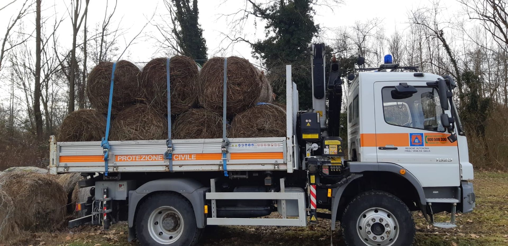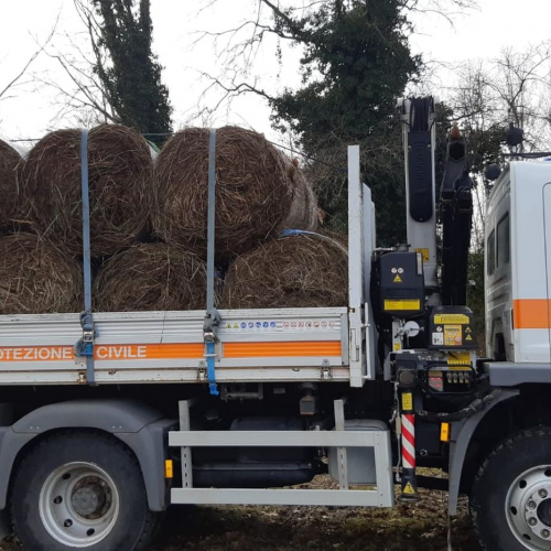Per la logistica siamo intervenuti con 3 funzionari della protezione civile per il caricamento, trasporto e scarico del materiale, costituito da 74 balle di sfalcio che dalla pianura, zona di Talmassons, è stato trasportato con il camion della protezione civile fino alla base logistica intermedia opportunamente allestita presso la sede distaccata della protezione civile di Tolmezzo.