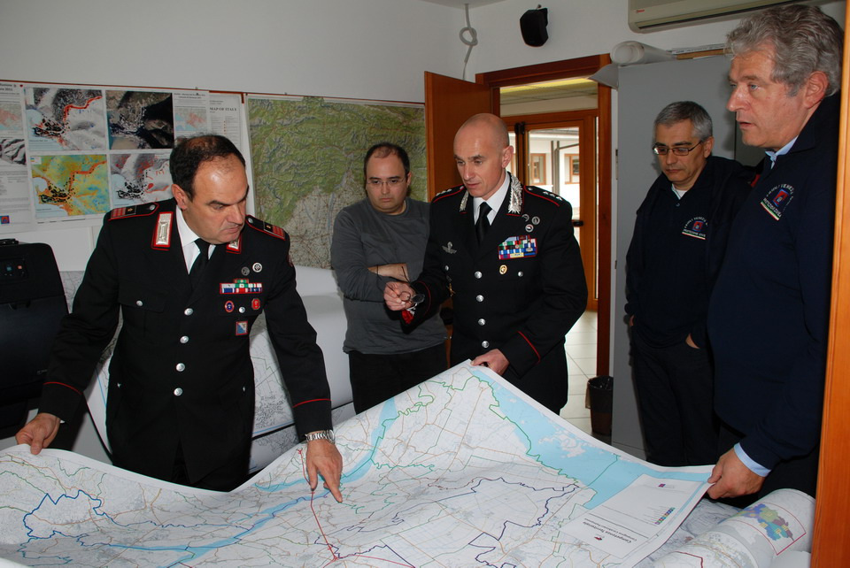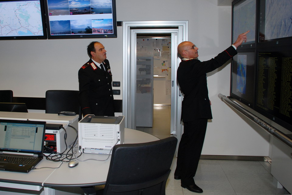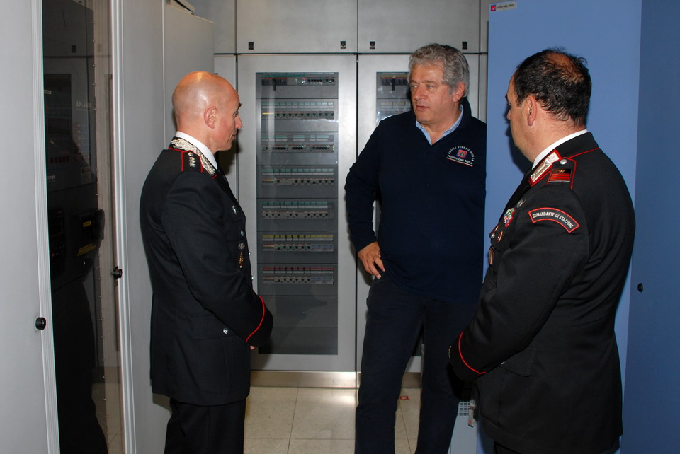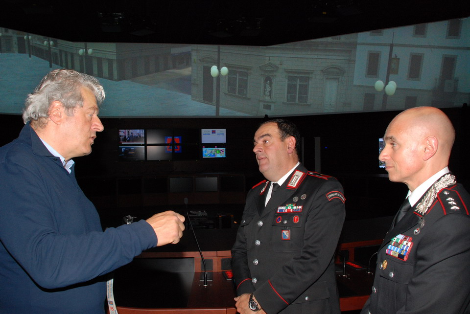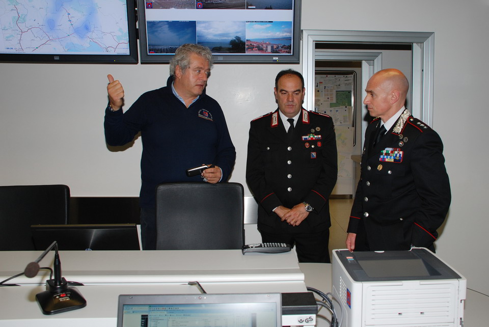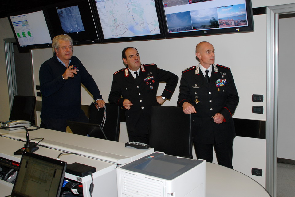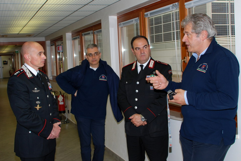 Nella mattinata di giovedì 30 maggio 2013 il Comandante della Compagnia Carabinieri di Palmanova, Capitano Maurizio Maiani, accompagnato dal Comandante della Stazione dei Carabinieri di Palmanova, Luogotenente Antonio Tomaiuolo, ha visitato la Sede regionale della Protezione civile di Palmanova. Gli ospiti sono stati accolti dal Direttore Centrale della Protezione civile, dott. Guglielmo Berlasso, che ha illustrato l’attuale assetto operativo, tecnologico e funzionale della struttura di Palmanova, nonché la sua evoluzione futura, soffermandosi in particolare sull’indispensabile collaborazione tra le istituzioni nella gestione di emergenze che colpiscono la popolazione e il territorio regionale. La visita si è quindi sviluppata dal polo cartografico alla Sala Operativa Regionale (SOR), passando dal centro di calcolo alla sala emergenze, per terminare nel nuovo Centro Funzionale, all’interno del quale verrà allestita, tra l’altro, la nuova sala interforze per la gestione congiunta delle emergenze. Gli ospiti hanno avuto così modo di conoscere le complesse strumentazioni utilizzate dalla Protezione civile Regionale nell'attività di sorveglianza fisica del territorio, di prevenzione ed allertamento e di gestione dei soccorsi. In particolare il Direttore ha illustrato le componenti tecnologiche utilizzate per la realizzazione della nuova Sala Operativa Regionale e della Sala interforze per la gestione delle emergenze che le rendono all’avanguardia dal punto di vista tecnologico e che rendono il Centro un esempio sia in ambito nazionale che in quello europeo.