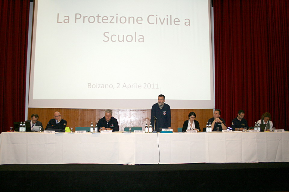 Sabato 2 aprile 2011 nella sala convegni dell'Hotel Four Points Sheraton di Bolzano si è svolto un importante convegno dal titolo “La Protezione Civile a scuola”. Hanno relazionato sull'argomento i direttori delle strutture di Protezione civile della Regione Friuli Venezia Giulia, Guglielmo Berlasso, della Regione Lombardia, Alberto Biancardi, della Regione Emilia Romagna, Demetrio Egidi, funzionari delle Regioni Veneto e Piemonte, il direttore dell'Ufficio prevenzione incendi della Provincia Autonoma di Bolzano, Giuseppe Marazzi, il Direttore Scuola Provinciale Antincendi, Provincia Autonoma di Trento, Ivo Erler, e la Responsabile dell'Ufficio Volontariato, Formazione e Comunicazione del Dipartimento della Protezione Civile, Titti Postiglione.