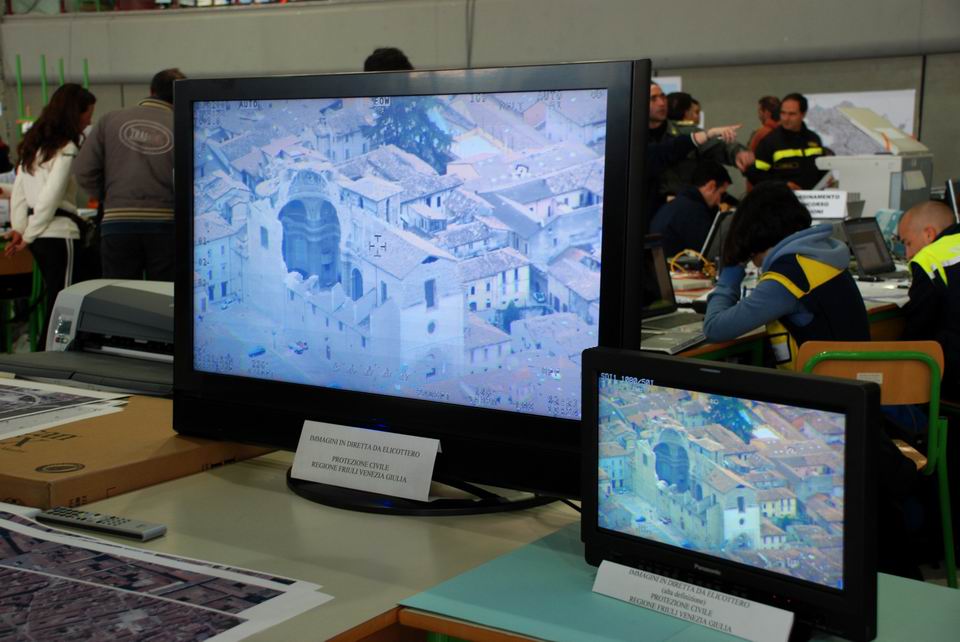 Nella mattinata di giovedì 9 aprile 2009 il Presidente della Repubblica, Giorgio Napolitano, si è recato in visita in Abruzzo per portare il suo sostegno e l’affetto di tutto il Paese alla popolazione colpita dal sisma. Il Capo dello Stato, dopo essersi recato alle tendopoli di Onna (AQ) e in quella più grande di San Demetrio (AQ), ha terminato la visita presso la Direzione di Comando e Controllo dell’emergenza (DI.COMA.C.), dove si è soffermato presso il tavolo operativo della Protezione civile del Friuli Venezia Giulia, apprezzandone gli strumenti tecnologici all’avanguardia a livello mondiale, quali laserscan, sistemi di ripresa fotografica digitale del terreno e il sistema di ripresa televisiva digitale in tempo reale ad alta risoluzione delle aree colpite dal sisma, con ritrasmissione delle stesse in real-time al DI.COMA.C. per il tempestivo coordinamento dei soccorsi. La Protezione civile del Friuli Venezia Giulia, Regione capofila in Italia in materia di Protezione civile, coordina le attività di soccorso di Regioni e Provincie autonome, costituendo il punto di collegamento tra i nuclei di intervento e la DI.COMA.C.