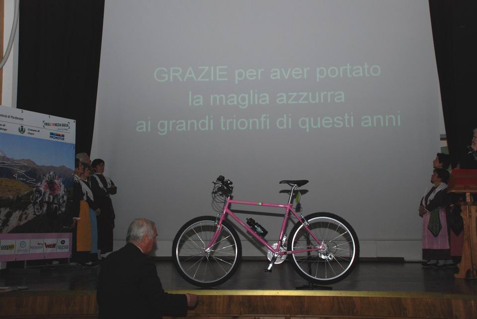 L’apice della cerimonia si è avuto con lo scoprimento da parte delle autorità presenti di una bicicletta-monumento appoggiata su un blocco di pietra locale, che farà bella mostra di sé al centro della piazza. Intitolata invece all’Associazione Friulana Donatori di Sangue la “Panoramica delle Vette” in cima al Monte Crostis, strada questa che lo scorso autunno è stata messa in sicurezza poco prima dell’arrivo delle prime nevicate. All’inaugurazione hanno partecipato anche l’Assessore Regionale allo Sport Elio De Anna, il sindaco di Comeglians Flavio De Antoni, l’Assessore Provinciale Ottorino Faleschini, il Patron della tappa Enzo Cainero, il Commissario della Comunità montana Giovanni Battista Somma, il Presidente dell’Associazione Friulana Donatori di Sangue, e gli altri sindaci della vallata.