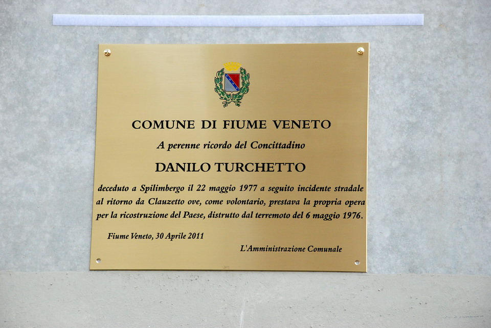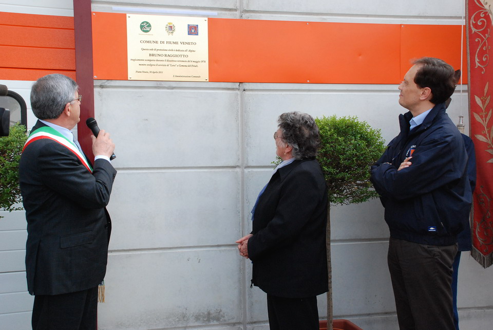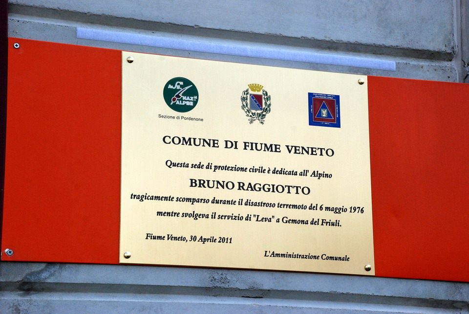 Sabato 30 aprile 2011 si è svolta a Fiume Veneto la cerimonia di intitolazione della sede del Gruppo comunale della Protezione civile di Fiume Veneto e della contigua Sede operativa comunale all'alpino Bruno Raggiotto, caduto nel crollo della caserma Goi a Gemona del Friuli il 6 maggio del 1976, ed a Danilo Turchetto, perito il 22 maggio del 1977 in un incidente stradale a Spilimbergo, mentre rientrava dalla sua opera di volontariato nella ricostruzione a Pradis di Clauzetto. Alla celebrazione hanno preso parte il Vicepresidente della Giunta Regionale ed Assessore alla Protezione civile, dott. Luca Ciriani, il direttore della Protezione Civile della Regione, dott. Guglielmo Berlasso, i sindaci di Fiume Veneto, Lorenzo Cella, e di Clauzetto, Giuliano Ceschutti, il vicepresidente della Provincia di Pordenone, Eligio Grizzo, il responsabile provinciale dell'ANA, autorità locali e delle rappresentanze dell'ANA e dei volontari.