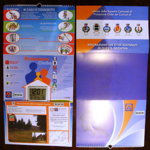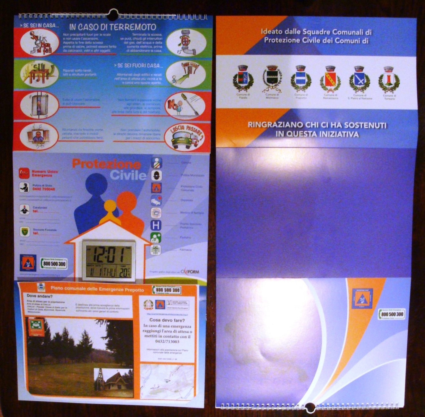 E’ proprio su quest’ aspetto, che il Coordinatore (il Comuna è primo fra gli altri del Distretto Val Natisone che hanno aderito all’ iniziativa), ha consegnato alle famiglie un calendario perpetuo, realizzato dai ragazzi del CIVIFOR di Cividale del Friuli (presenti il coordinatore Canciani e la tutor del settore grafico dell’ Istituto, De Sabata) che ha la particolarità di essere un valido promemoria di norme di comportamento, numeri utili in caso di emergenza e di avere in evidenza il pieghevole del piano con indicata appunto l’area di attesa di ogni singola famiglia.