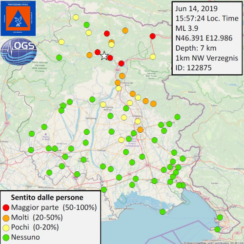 Tra le 18.30 e le 19.00 erano circa 150 le schede di risentimento sismico compilate dai volontari che ringraziamo per la preziosa collaborazione. Le schede compilate online  riportano come informazione l' assenza di danni a persone e cose e la maggioranza della popolazione allertata per avere distintamente sentito la scossa nel comune di Tolmezzo e nei comuni limitrofi all'epicentro come Cavazzo, Moggio Udinese, Verzegnis. Alle ore 20.00 sono circa 170 le schede di risentimento sismico compilate arrivate alla Sala Operativ Regionale di Palmanova.