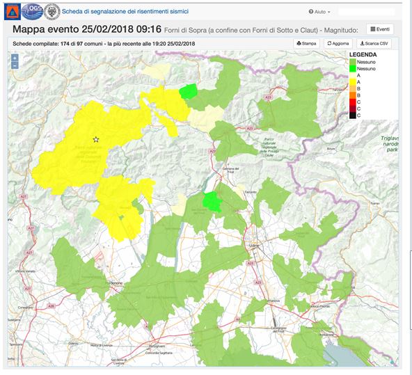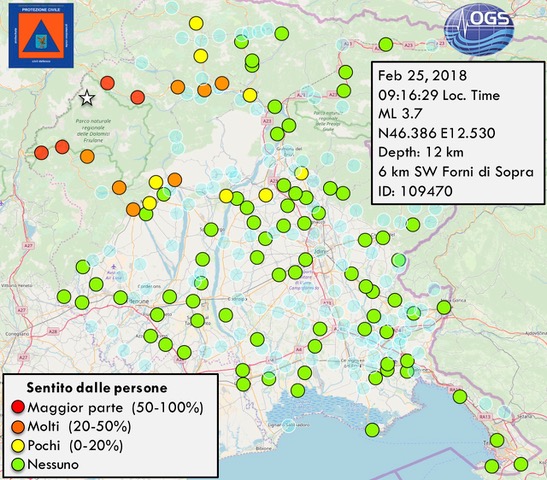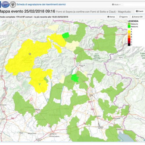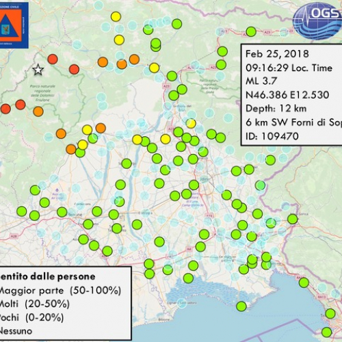 Come detto, a seguito dell’evento delle ore 9:16, il sistema di segnalazione degli effetti sul territorio sviluppato dalla Protezione Civile con l' OGS- CRS e’ stato attivato nella zona di Forni di Sopra. I Volontari dei Gruppi Comunali di Protezione Civile hanno compilato online le schede di risentimento sismico, appuntando le osservazioni rilevate sul territorio e indicando il livello di percezione del sisma da parte della cittadinanza.