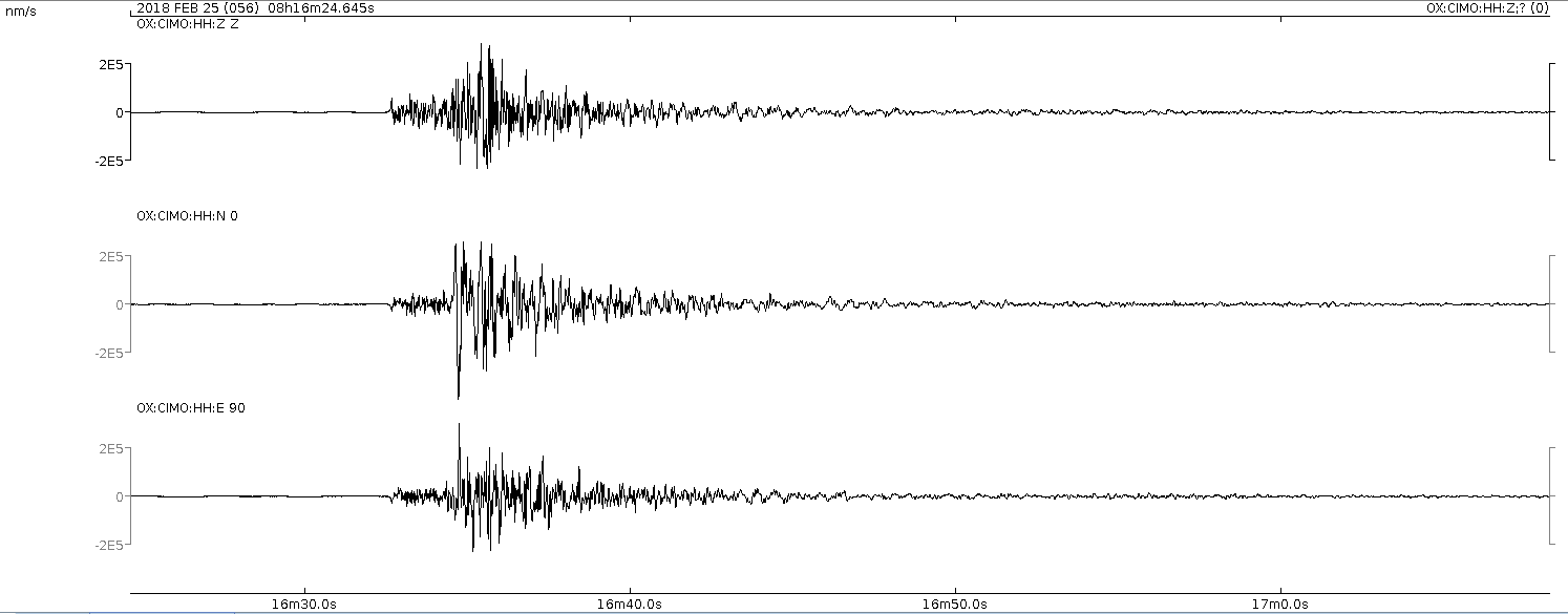 Le immagini riportano il sismogramma della scossa di terremoto di ML 3.7 delle h 9.16 del 25/2/2018, la localizzazione della sequenza sismica, le mappe tematiche di risposta del territorio grazie alla compilazione delle schede di risentimento sismico da parte dei volontari di protezione civile opportunamente formati dai tecnici dell' OGS.