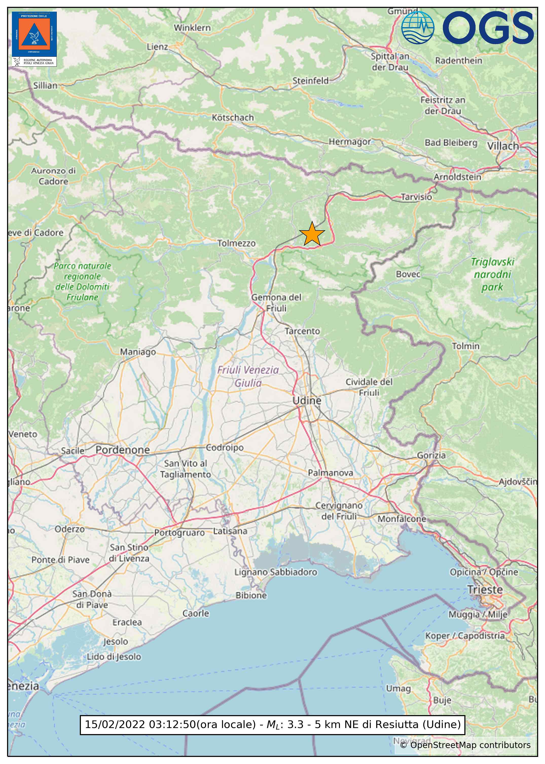Terremoto Moggio Udinese. Resoconto del risentimento sismico in regione. Un terremoto è stato registrato in regione, nella notte del 15 febbraio ultimo scorso presso MOGGIO UDINESE. L'evento sismico è stato segnalato dalle rete sismometrica di OGS-CRS alle ore 03:12 (ora italiana) con di magnitudo ML 3.4 a una profondità di 10 km, a 5.0 km da Dogna (UD), a 6.1 km da Moggio Udinese (UD), a 6.4 km da Chiusaforte (UD). Il terremoto non ha provocato danni a persone e cose.