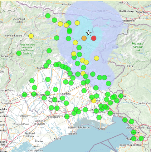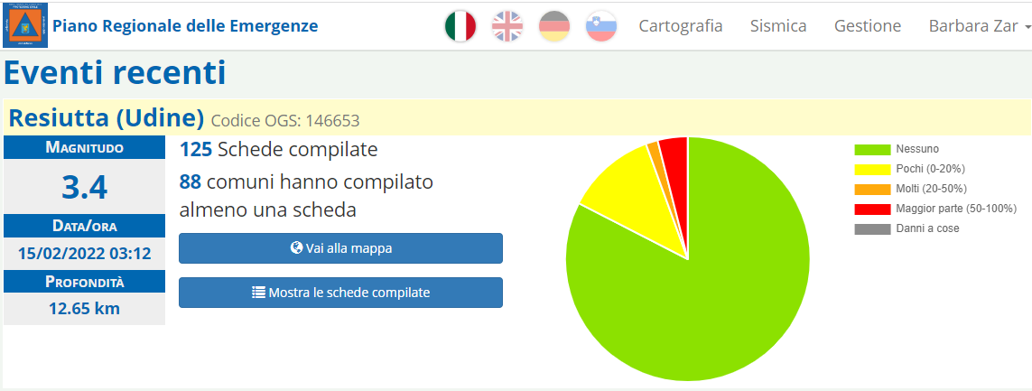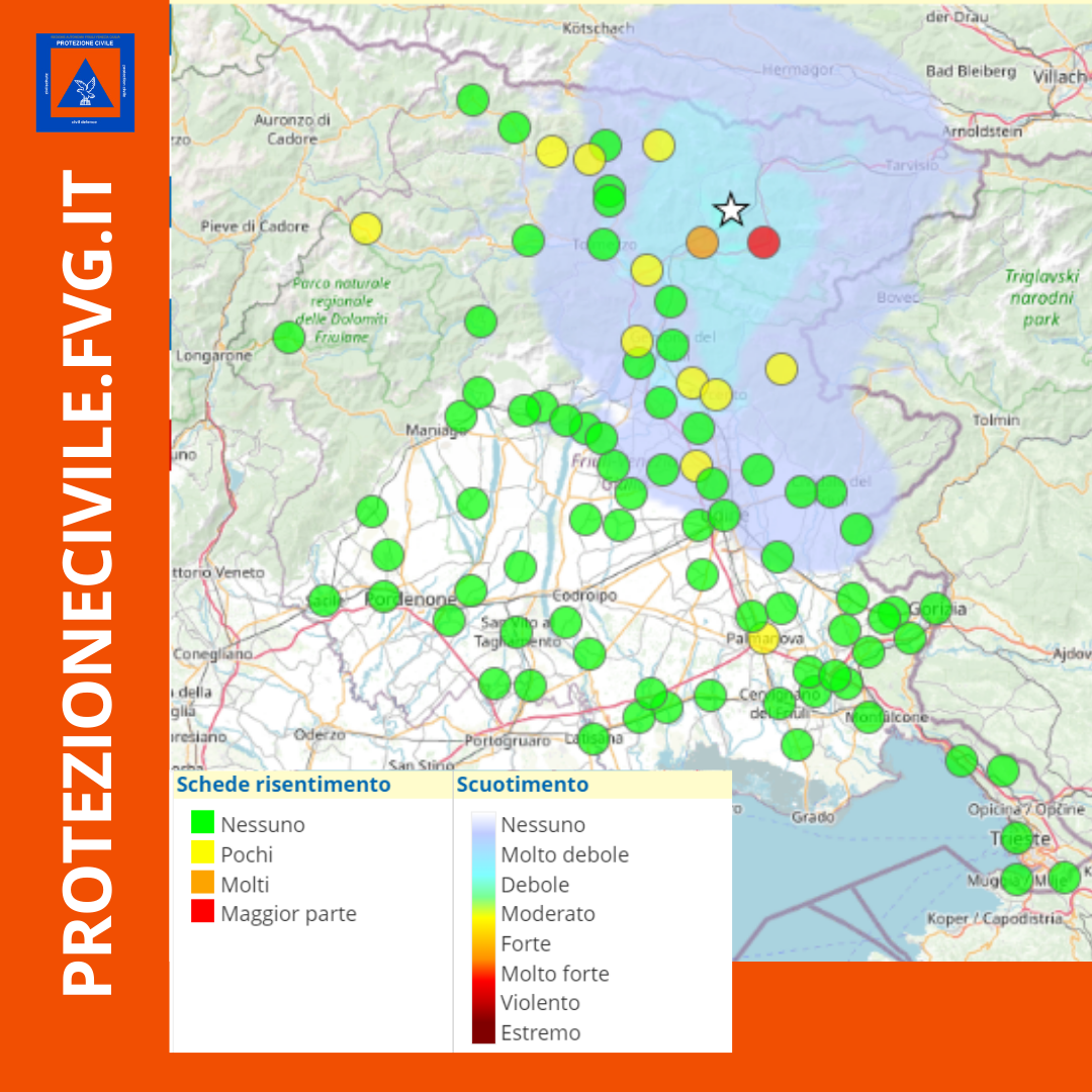 Il sistema di Protezione civile regionale si è attivato con la Sala Operativa di Palmanova per l'apertura dell'evento e la compilazione delle schede di risentimento sismico da parte dei volontari dei gruppi comunali abilitati. Sono state compilate 125 schede di risentimento sismico riferite a 88 comuni. Le schede riportano per il Comune di Chiusaforte evento avvertito dalla maggior parte dei cittadini senza danni a persone e cose. per il Comune di Moggio udinese le schede compilate riportano che l'evento è stato avvertito da molti mentre per i comuni di Ravascletto, Forni di Sopra, Tarcento, Taipana, Pagnacco, Magnano in riviera, Trasaghis, Sutrio, Paularo e Amaro, l' evento è stato avvertito da pochi. Sono 104 pari all'83% del totale, le schede compilate che riportano evento non avvertito dalla popolazione.