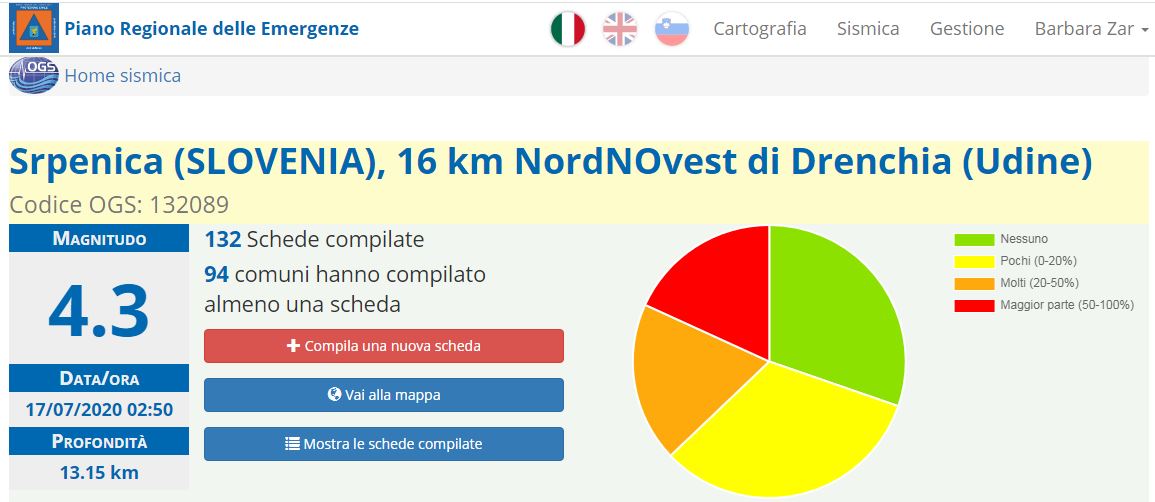 Oggi, 17 luglio 2020 alle ore 4:51 locali, la Rete Sismometrica del Friuli Venezia Giulia ha rilevato un terremoto di magnitudo 4,3 localizzato in territorio sloveno nord-occientale, 3 km a sud-est di Bovec (epicentro: Latitudine 46° 18’.8 N; Longitudine 13° 31’.9 E), tra le località di Srpenica e Cesoca, profondità circa 8km localizzazione rivista dal personale del Centro di Ricerche Sismologiche -OGS). Sono seguite subito 2 repliche di magnitudo 1,7 (05:12), magnitudo 1,4 (05:14). Altre repliche si sono succedute fino alle 06:11. La mappa mostra la localizzazione del CRS della scossa principale del 17 luglio 2020.