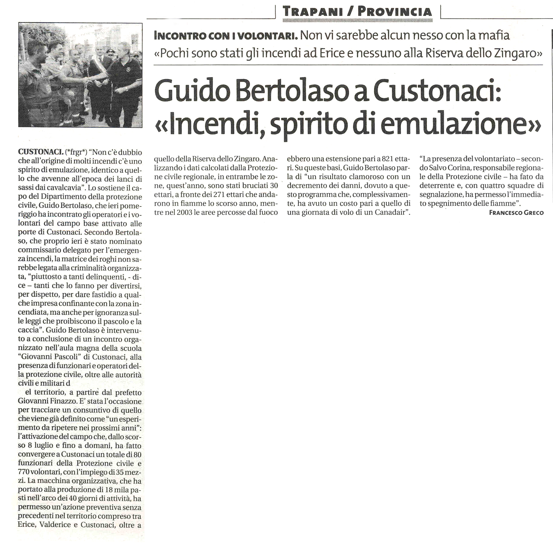 Il Capo Dipartimento della Protezione Civile Nazionale, Guido Bertolaso, venerdì 24 agosto 2007 ha visitato a Custonaci le zone colpite dai roghi e ha incontrato i funzionari e i volontari della Protezione civile che si sono impegnati nell’opera di spegnimento e nel pattugliamento delle zone a rischio.