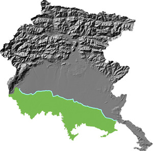 A valle della fascia della Linea delle Risorgive si sviluppano i potenti depositi della Bassa friulana che, procedendo da nord verso sud, in sinistra Tagliamento presentano tanto orizzontalmente quanto verticalmente una diminuzione della frazione grossolana, con passaggio da depositi spesso cementati a depositi decisamente sciolti e da orizzonti ghiaioso-sabbiosi a depositi a granulometria decisamente fina nella fascia perilagunare.