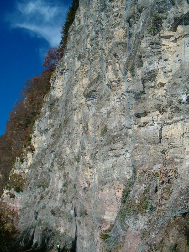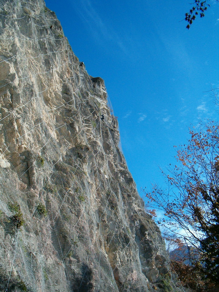 In particolare è stato necessario effettuare il disgaggio di un tratto di versante (delle dimensioni pari a circa 90 ml di lunghezza per 50 ml di altezza) rimuovendo i massi pericolanti e la vegetazione che potesse creare nuovi fenomeni di instabilità. Si è provveduto successivamente a rivestire tale versante con rete metallica in aderenza e funi ancorate con barre.