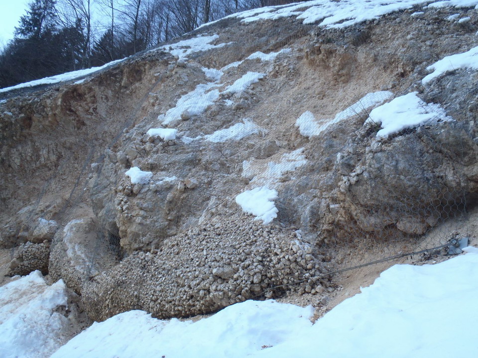 - consolidamento della parete mediante la posa in opera di una rete in aderenza rinforzata con un reticolo di funi di acciaio fissate al terreno mediante ancoraggi in barra di acciaio;