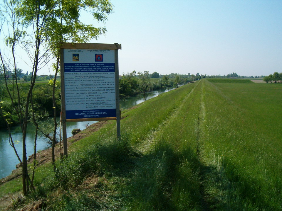 Stanno giungendo a conclusione i lavori di sistemazione idraulica del canale Postumia-Malgher nel tratto compreso tra la confluenza dei fiumi Fiume e Sile in corrispondenza del confine amministrativo tra le Regioni Friuli Venezia Giulia e Veneto, fino al "salto di Corbolone" attraversando i Comuni di Meduna di Livenza (TV), Motta di Livenza (TV) e S. Stino di Livenza (VE), denominati OPI CD3/484.011.