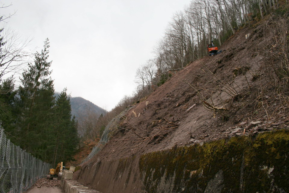 Un primo intervento, realizzato nei giorni immediatamente successivi l’evento calamitoso, è consistito nello sgombero del materiale franato e nell’alleggerimento del corpo di frana mediante l’abbattimento degli alberi presenti e nello scarico verso valle del materiale in precarie condizioni di stabilità.