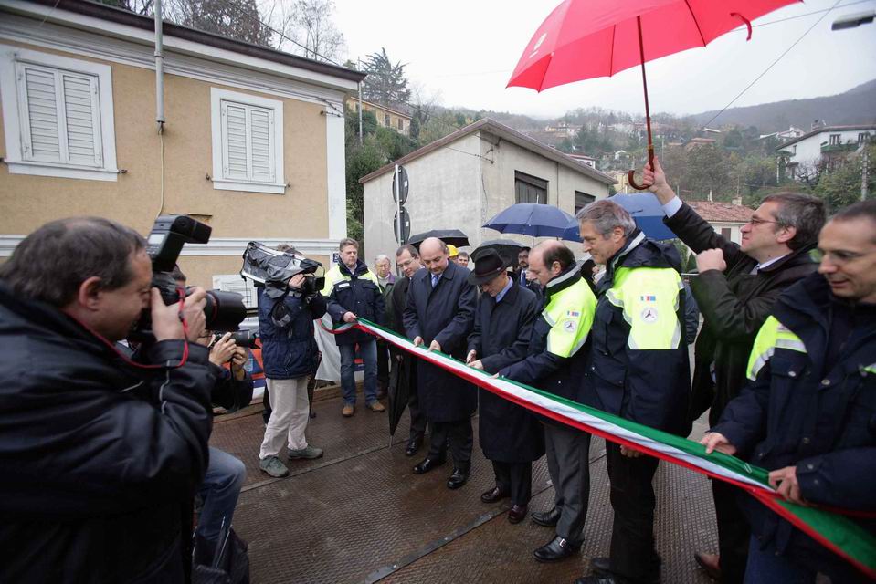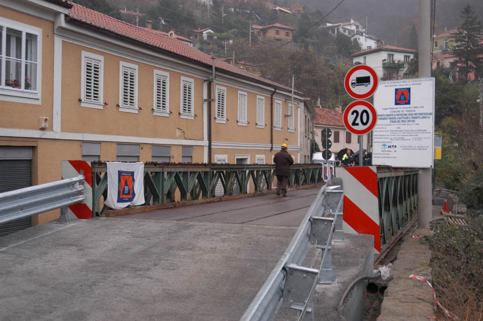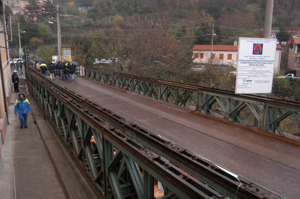 Il ponte Bailey (lungo 25 metri e largo 6 con una larghezza utile per il transito dei mezzi di 4,5), posato in opera al fine di scavalcare l’area di dissesto che da domenica 19 novembre aveva interrotto la strada del Friuli, è stato realizzato a tempo di record – ha dichiarato l’Assessore Moretton, aggiungendo inoltre: “Tra non molto inizieremo i lavori del manufatto definitivo con l’eliminazione di una curva pericolosa e il riempimento di una larga area dove verrà realizzato un parcheggio. Si tratta di un intervento che sarà coperto finanziariamente dalla compartecipazione al 50 per cento dalla Regione e dal Comune di Trieste. A settembre del prossimo anno i lavori saranno ultimati e costituiranno un buon esempio di accordo e collaborazione tra le istituzioni a favore della cittadinanza”.