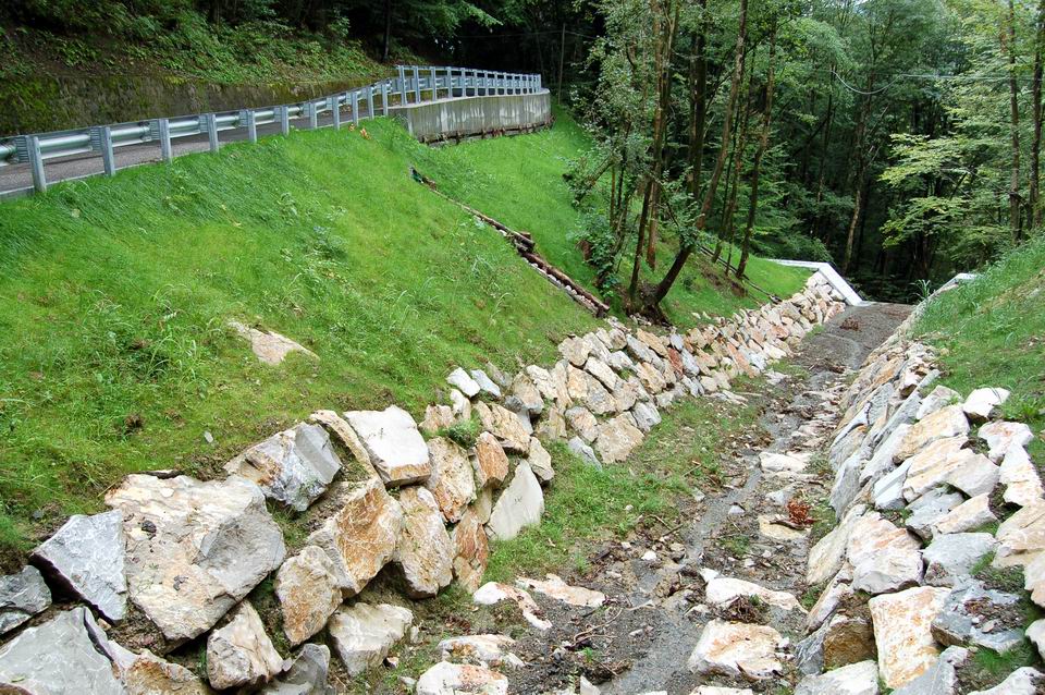 L’intervento (CD2/444.025), consistito nel consolidamento e la sistemazione di versanti in frana, ha previsto anche il rialzo della sede stradale, la rimozione e il riposizionamento in opera del guard-rail, la nuova asfaltatura della sede viaria e l’esecuzione di una scogliera lungo le sponde del rio per una trentina di metri.