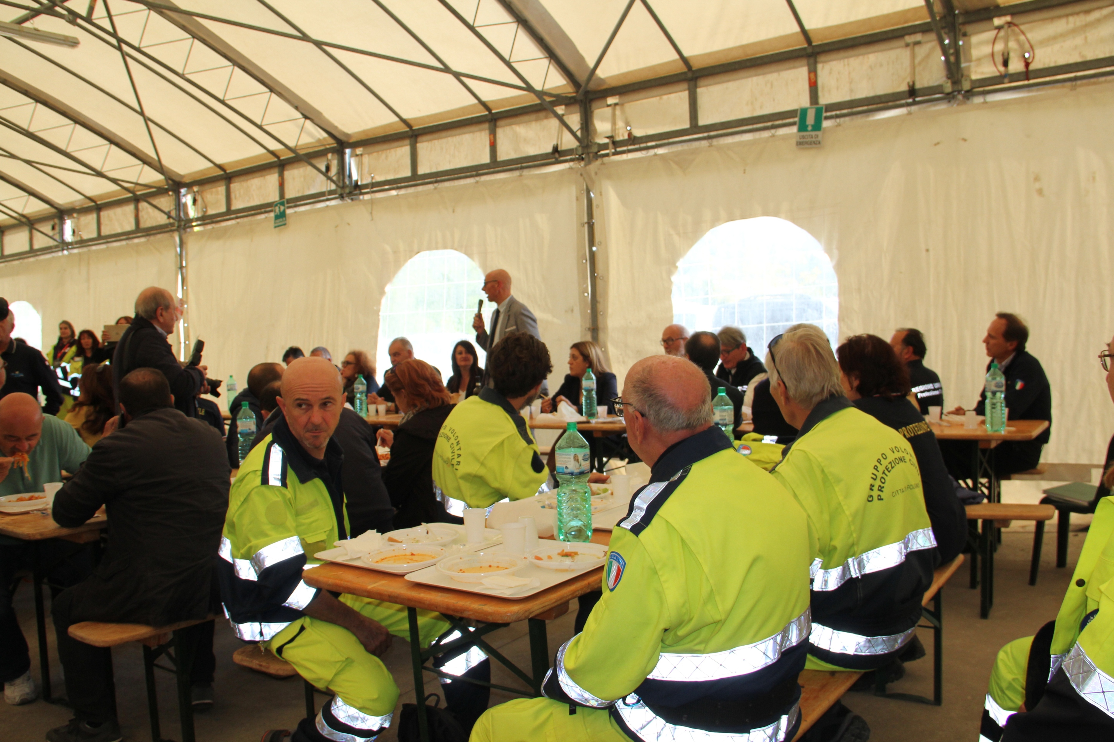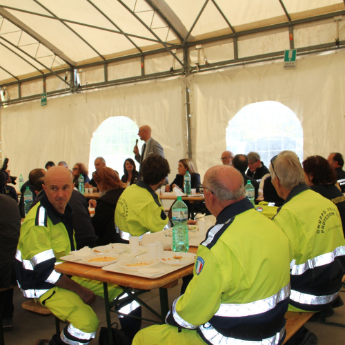 Alla cerimonia è seguito un pranzo conviviale con le autorità nella tensostruttura allestita presso il Comune di Gualdo Tadino dove, alcuni volontari e cittadini delle località vicine hanno ricordato l’opera dei volontari della nostra regione che operarono in quelle zone dando già allora dimostrazione di efficacia ed efficienza. Particolarmente significativo è stato il momento in cui, la sig. Rosanna Rinaldini, all’epoca maestra a S. Lorenzo di Gualdo Tadini, riconosciute le divise di protezione civile del “FRIULI VENEZIA GIULIA” è venuta personalmente a ringraziare i volontari, ricordando i volontari dei gruppi della Carnia e consegnandoci il  libro con dedica per ringraziarci e in ricordo del grande spirito di generosità, solidarietà e dedizione nell’ aiutare le popolazioni.