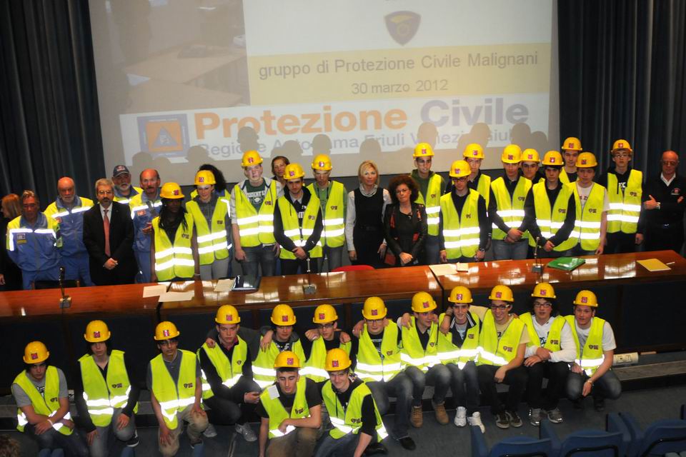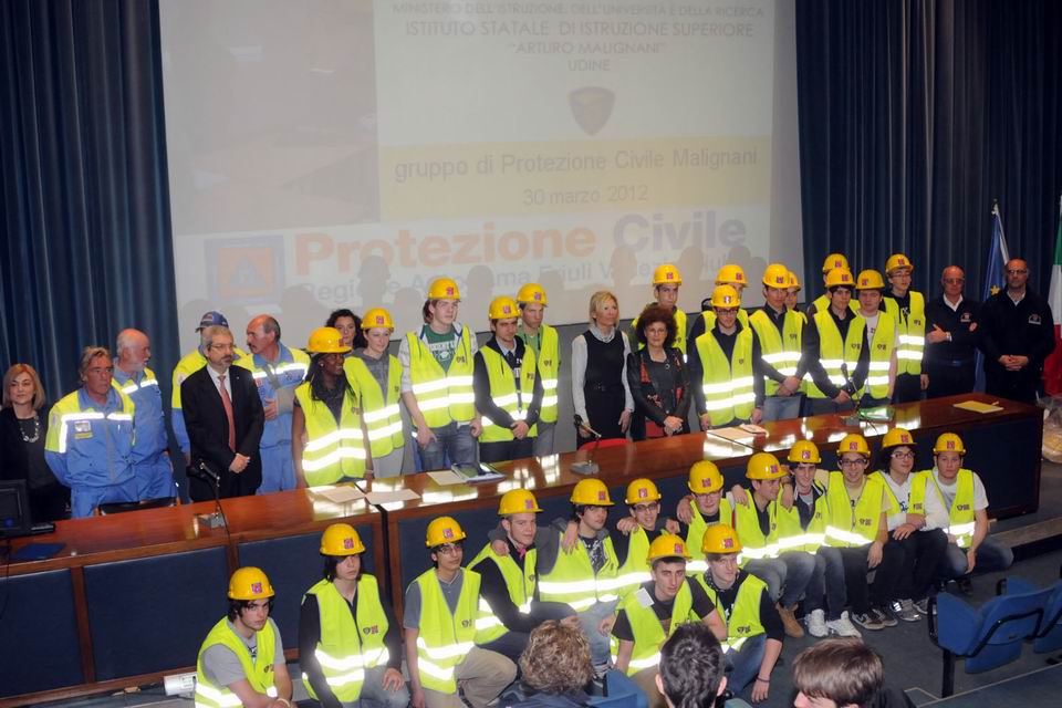 Venerdì 31 marzo 2012 all’ITIS “A. Malignani” di Udine si è svolta la cerimonia di consegna delle divise da volontario di Protezione civile a 40 studenti fra i 16 e 18 anni che hanno seguito un percorso formativo in tema di prevenzione ed emergenza, nell’ambito della convenzione tra l’istituto scolastico e la Protezione civile della Regione. Tale convenzione prevede un programma triennale con una serie di pacchetti formativi e di progetti che interesseranno a vari livelli gli insegnanti e a rotazione gli studenti.