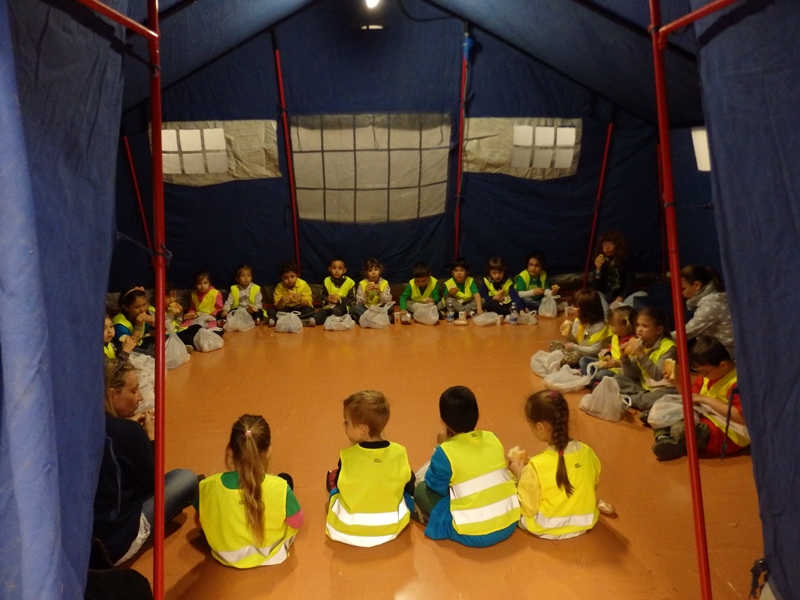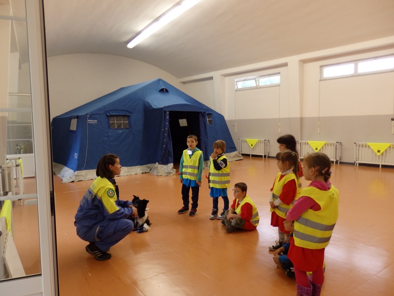 Il pranzo collettivo al sacco è stato consumato all'interno di una tenda montata precedentemente nella palestra della struttura. Di seguito, nell'ottica di una simulazione di soccorso alla popolazione, tutti i bambini hanno provveduto ad allestirne l'interno con coperte, sacchi a pelo e generi di prima necessità.