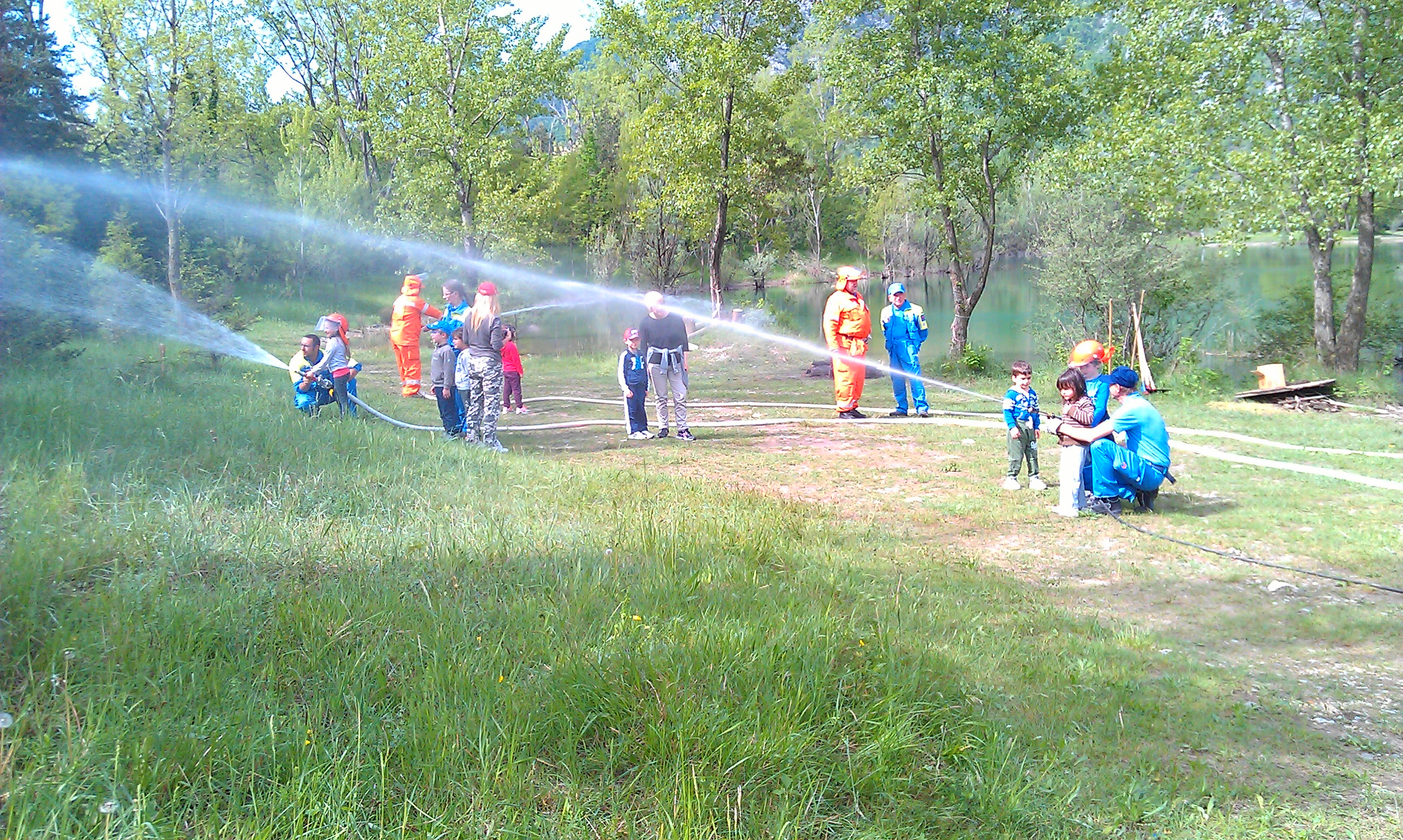 Ai bambini dell'asilo, successivamente, è stata dimostrata una prova di spegnimento di un piccolo e contenuto incendio boschivo ed illustrate le attrezzature in carico al locale Gruppo di Protezione Civile. Infine gli stessi hanno potuto sperimentare praticamente l'utilizzo delle lance di spegnimento indirizzandole su delle fiamme disegnate su appositi tabelloni.