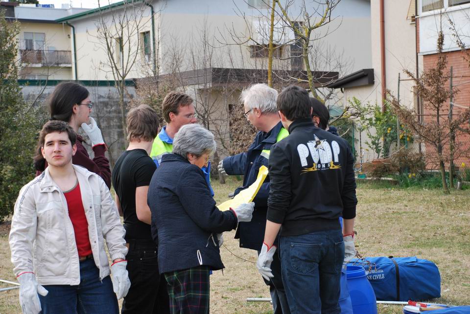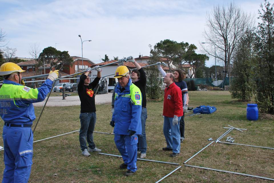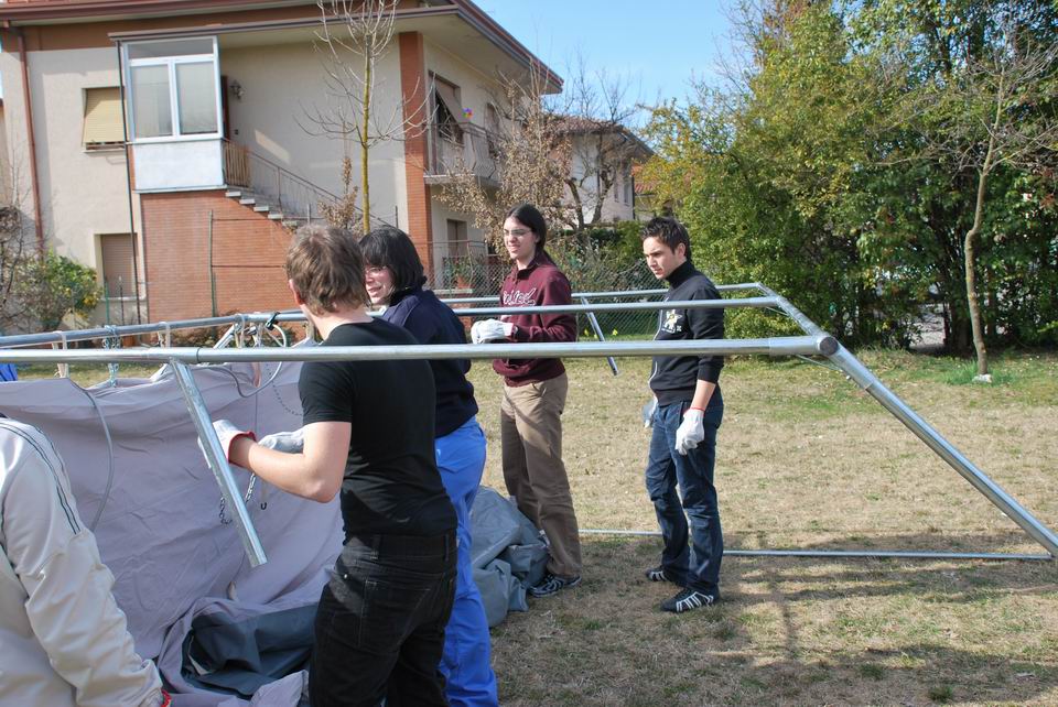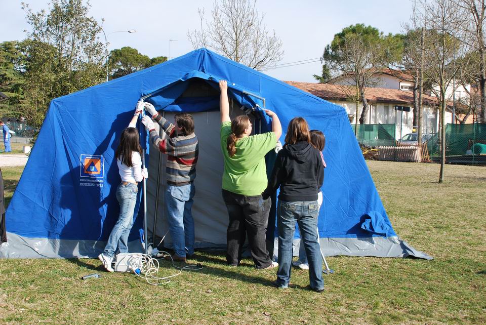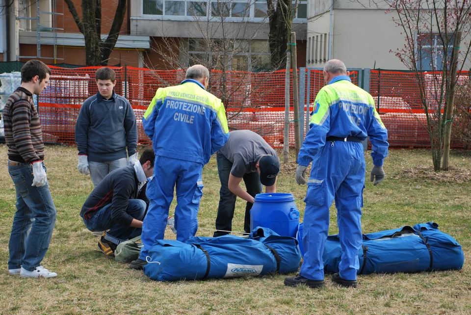 Dopo la lezione teorica, martedì 24 marzo 2009, gli studenti hanno eseguito una prova pratica di montaggio/smontaggio tende, supportati dai volontari di Protezione civile di Pordenone e hanno appreso l’importanza di una risposta tempestiva ed efficiente in caso di reale evento emergenziale.