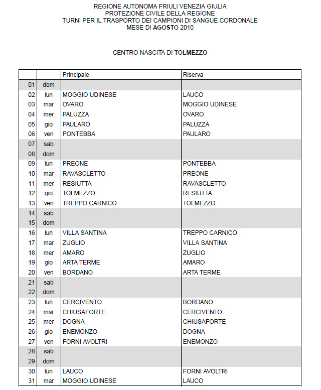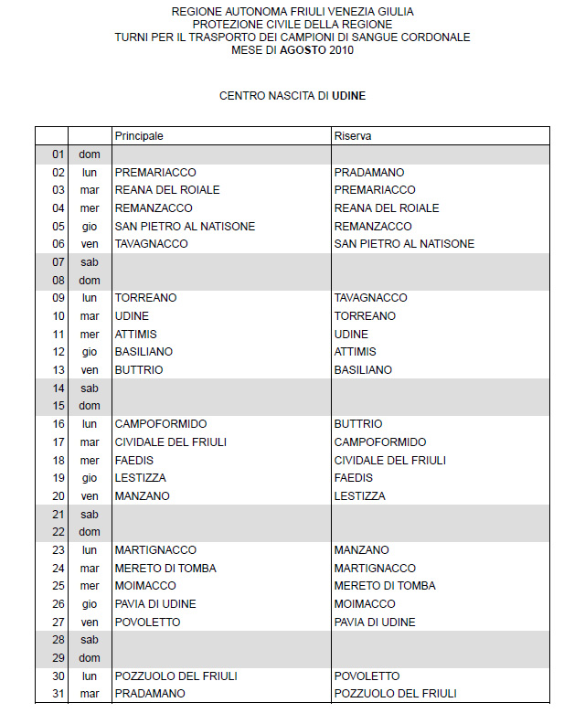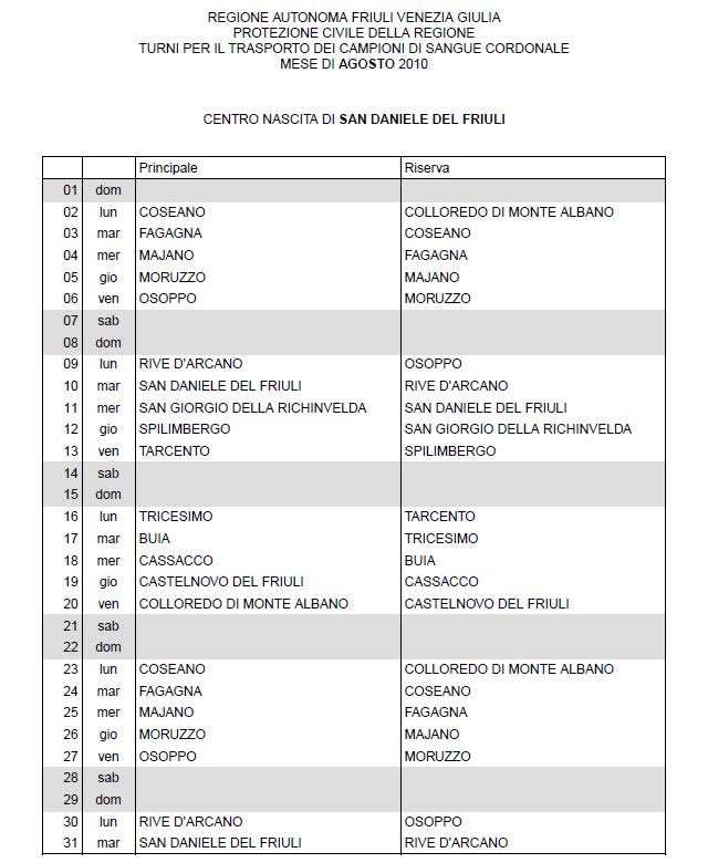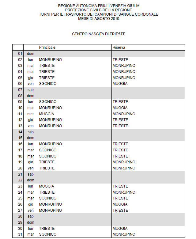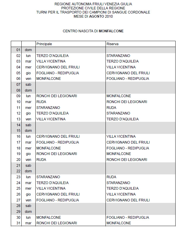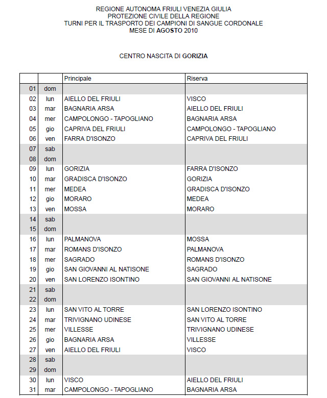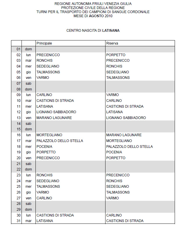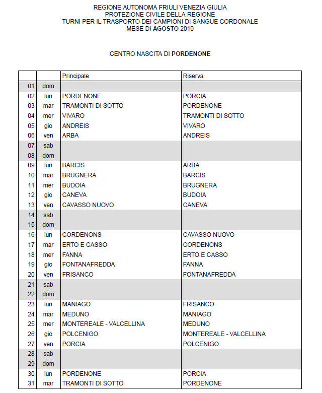 In questa pagina vengono pubblicati i calendari dei turni del mese di AGOSTO 2010 per il trasporto dei campioni di sangue cordonale (presentazione progetto) dei centri nascita regionali di raccolta: Gorizia, Udine, Pordenone, S.Daniele, Tolmezzo, Trieste, Latisana, Monfalcone e San Vito al Tagliamento (tabella degli indirizzi dei centri di raccolta attivi). Cliccandoci sopra è possibile aprire e stampare il file in formato pdf.