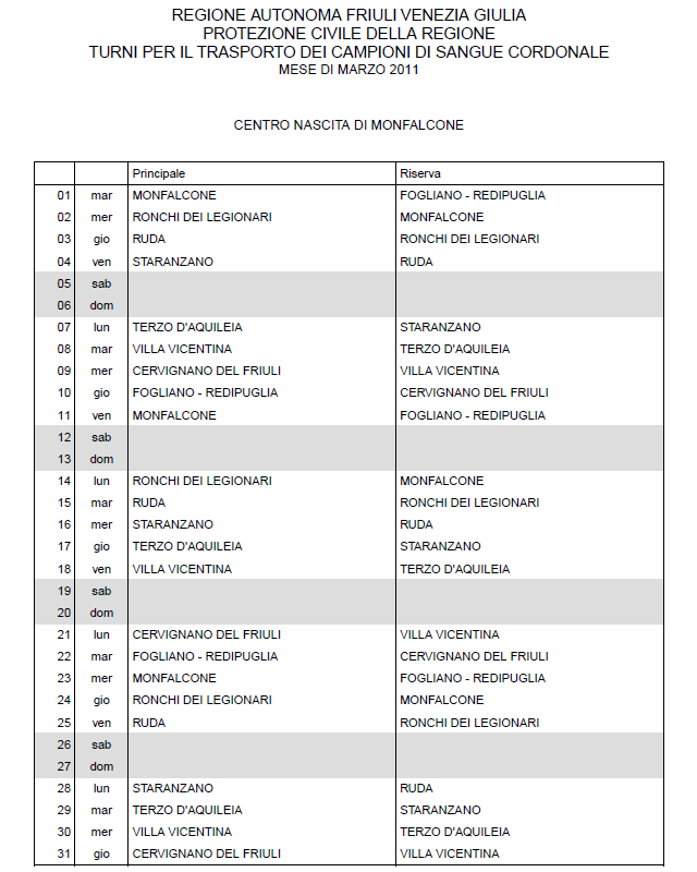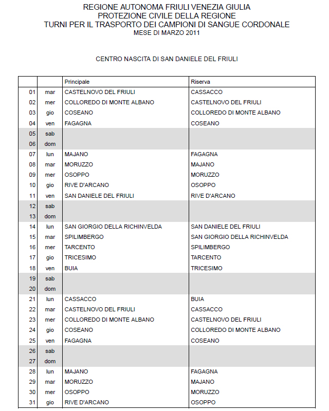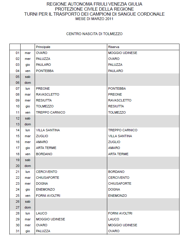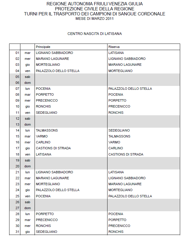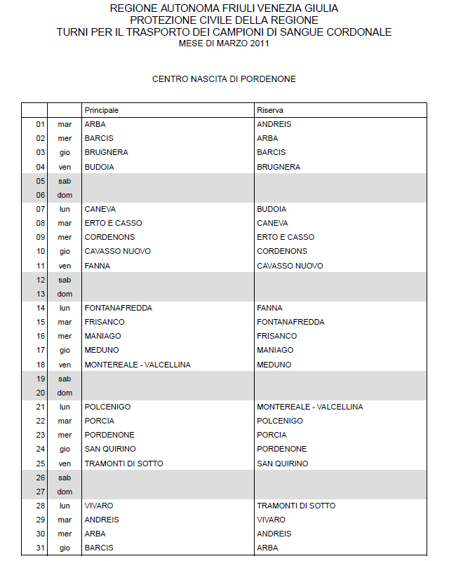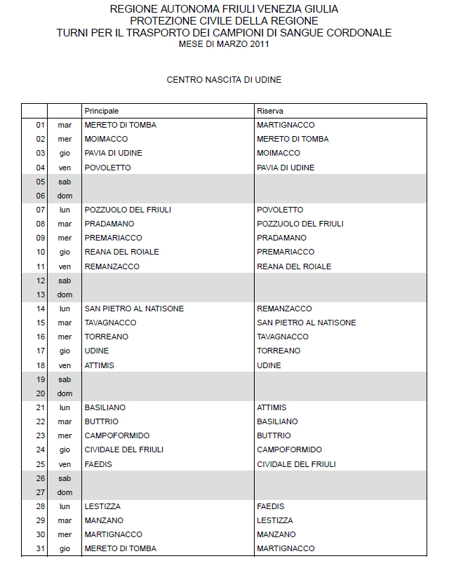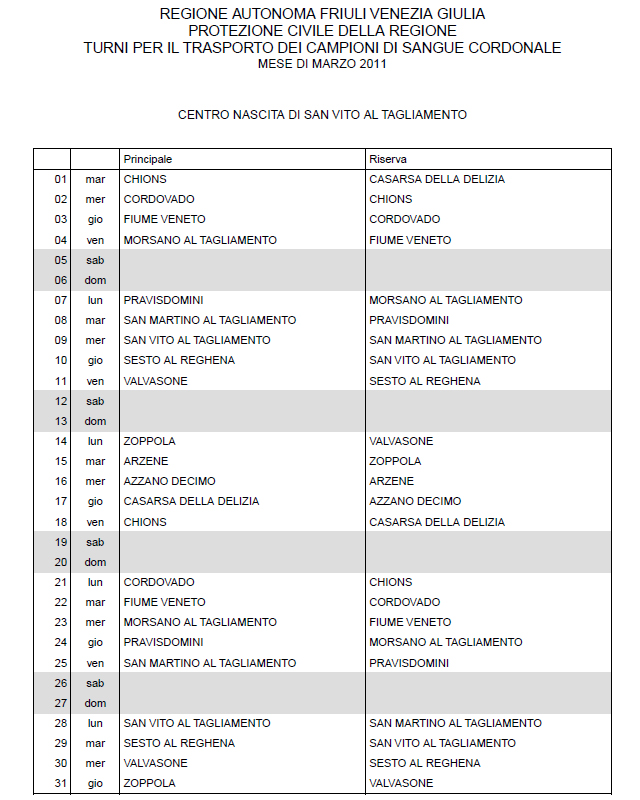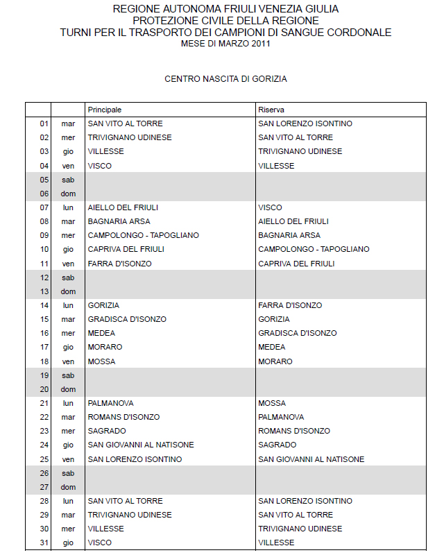 In questa pagina vengono pubblicati i calendari dei turni del mese di MARZO 2011 per il trasporto dei campioni di sangue cordonale (presentazione progetto) dei centri nascita regionali di raccolta: Gorizia, Udine, Pordenone, S.Daniele, Tolmezzo, Trieste, Latisana, Monfalcone e San Vito al Tagliamento (tabella degli indirizzi dei centri di raccolta attivi). Cliccandoci sopra è possibile aprire e stampare il file in formato pdf.