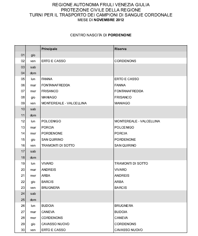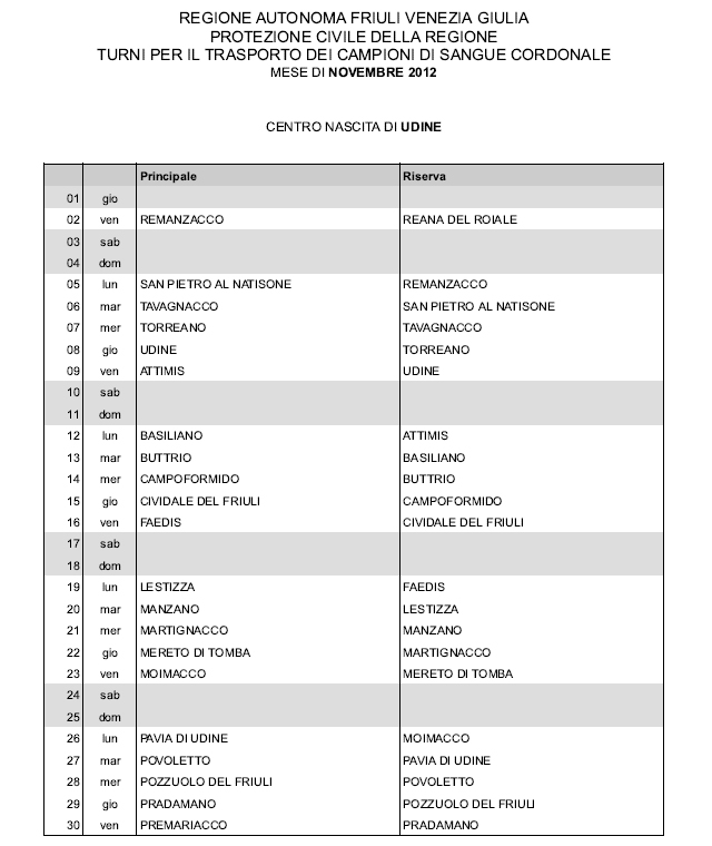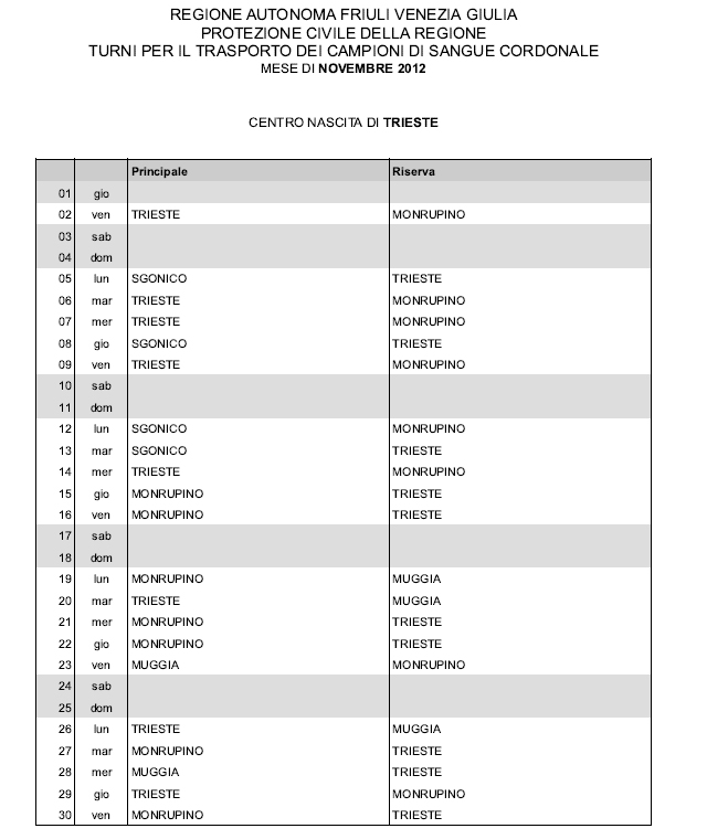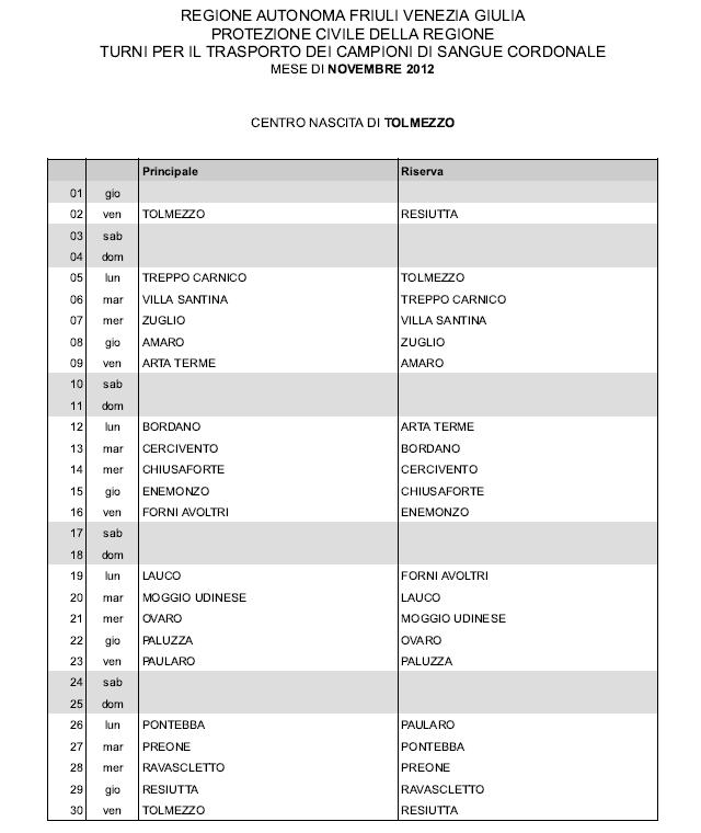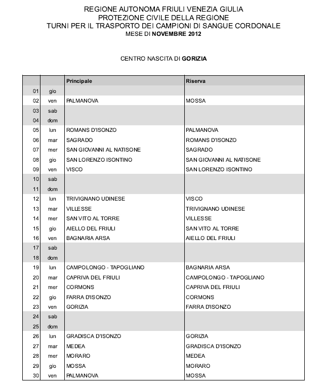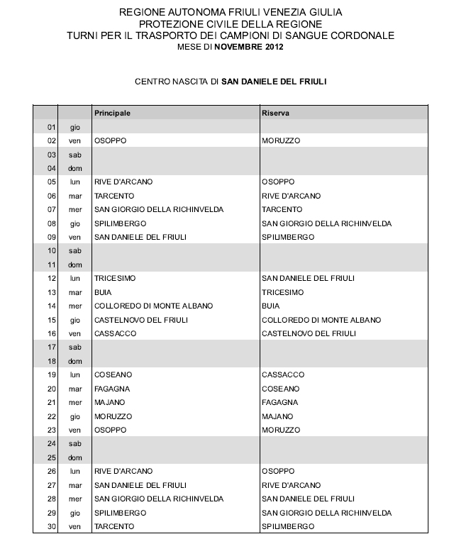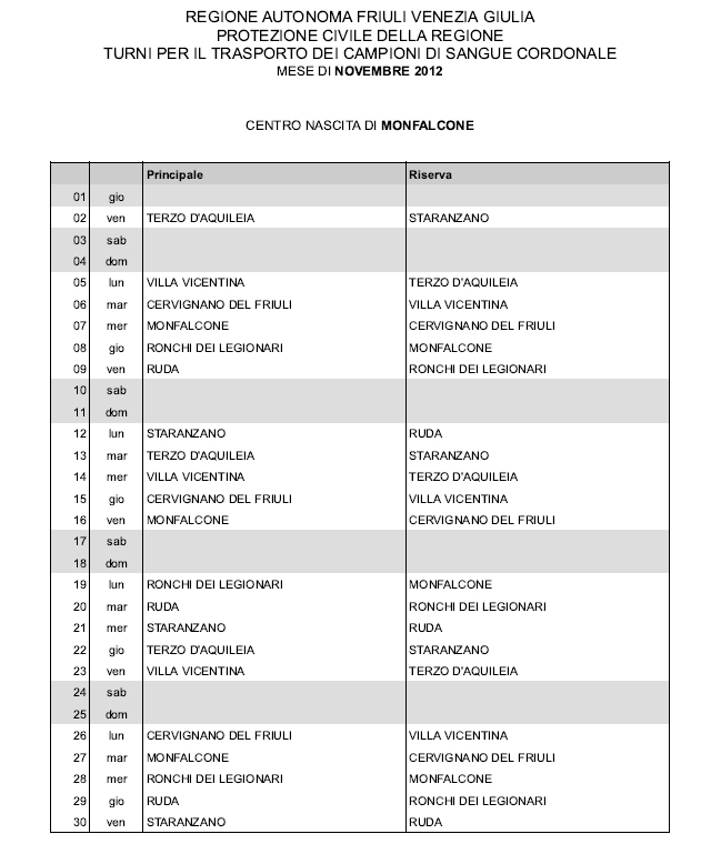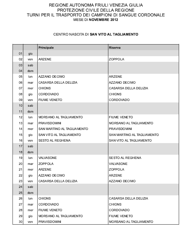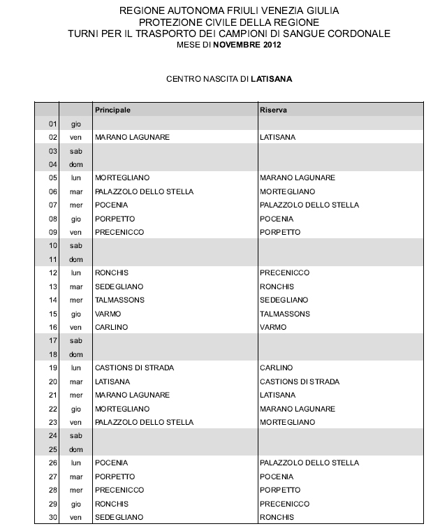 In questa pagina vengono pubblicati i calendari dei turni del mese di NOVEMBRE 2012 per il trasporto dei campioni di sangue cordonale (presentazione progetto) dei centri nascita regionali di raccolta: Gorizia, Udine, Pordenone, S.Daniele, Tolmezzo, Trieste, Latisana, Monfalcone e San Vito al Tagliamento (tabella degli indirizzi dei centri di raccolta attivi). Cliccandoci sopra è possibile aprire e stampare il file in formato pdf.