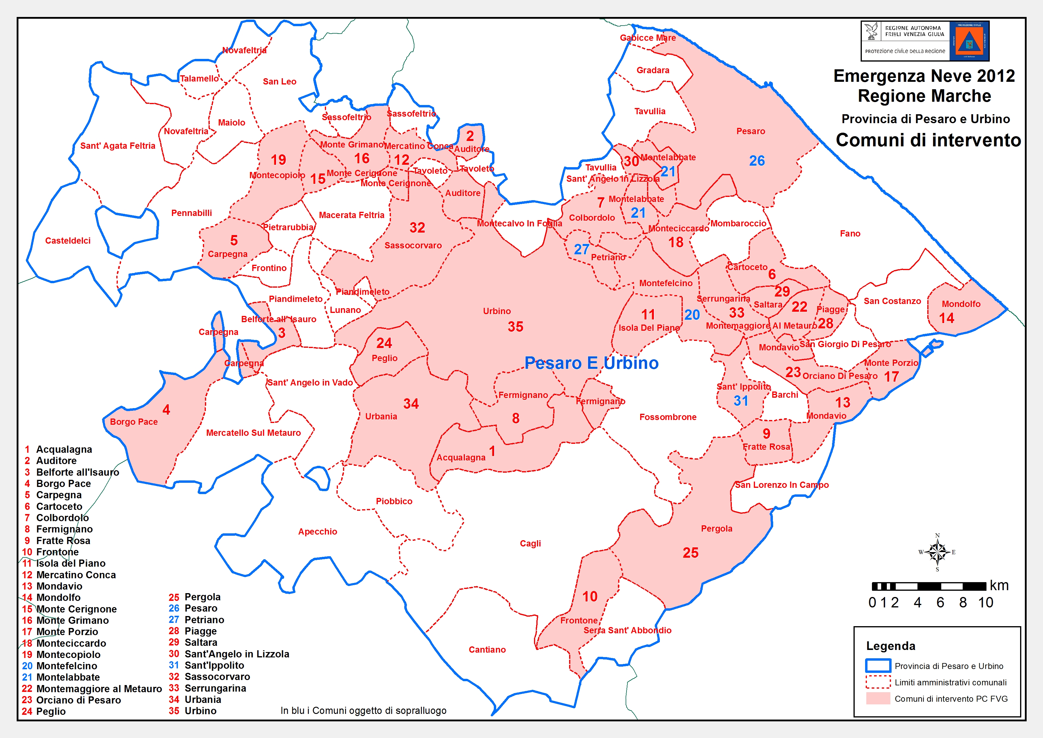 Dal 13 al 17 febbraio 2012 oltre 250 Volontari di Protezione civile e del Soccorso Alpino, 16 funzionari della Protezione civile regionale, 27 operatori di mezzi d’opera e 110 mezzi tra turbine, combinati fresa/lama, pale gommate, bob cat, autocarri, fuoristrada e camion con sale sono stati messi in campo dalla Protezione civile della Regione Friuli Venezia Giulia nelle Marche per affrontare l’emergenza neve.