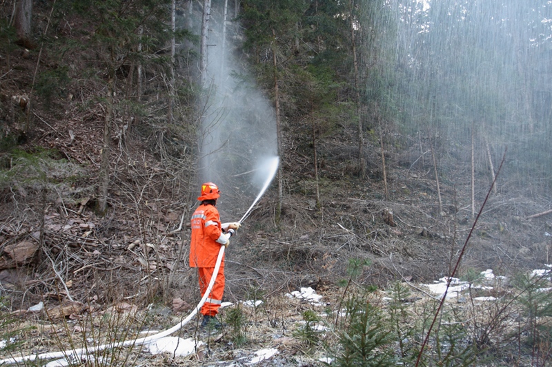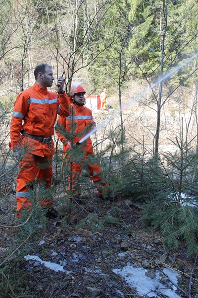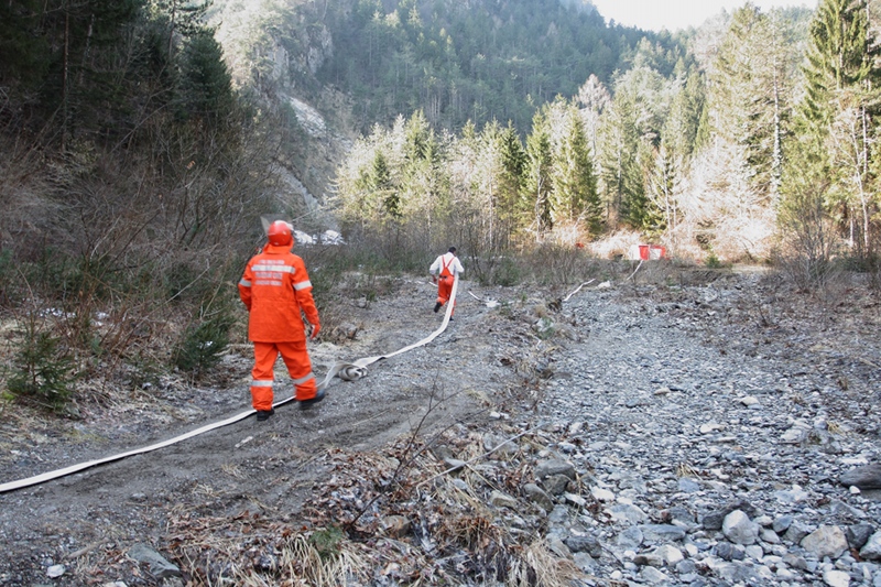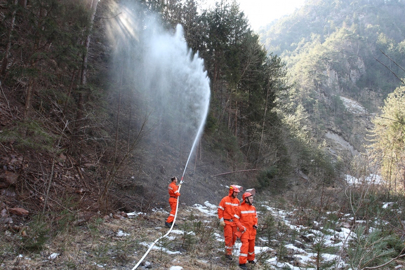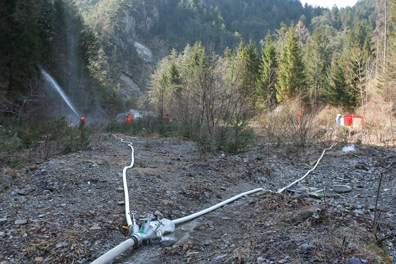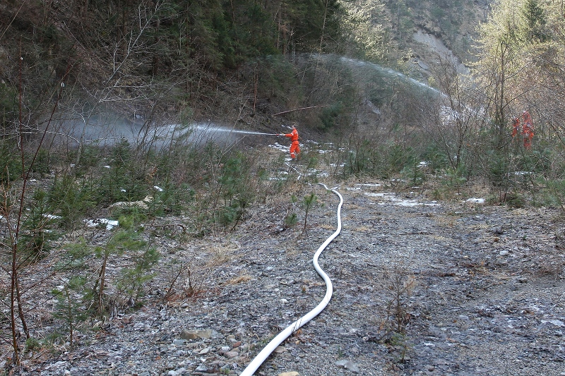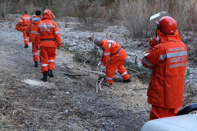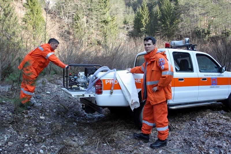 - Nello stesso tempo un terzo gruppo di volontari stava già operando a monte, nei pressi del rio Chiaulon, per congiungere la linea di alimentazione di 70 a un vascone di 6000 litri, una linea di 45 di derivazione e una linea di 25 da pompa ad alta pressione verso l'ipotizzato fronte dell'incendio.