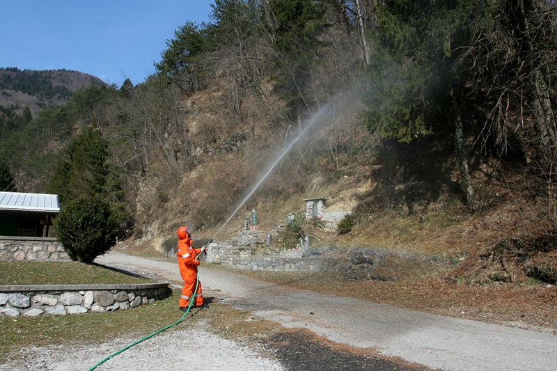 - Nello stesso tempo un terzo gruppo di volontari stava già operando a monte, nei pressi del rio Chiaulon, per congiungere la linea di alimentazione di 70 a un vascone di 6000 litri, una linea di 45 di derivazione e una linea di 25 da pompa ad alta pressione verso l'ipotizzato fronte dell'incendio.