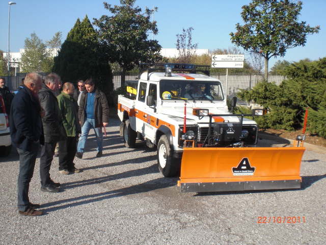 La prima giornata del corso è stata dedicata alla formazione relativa all'allestimento e la guida in sicurezza del fuoristrada Land Rover Defender dotato di lama sgombraneve e spargisale.