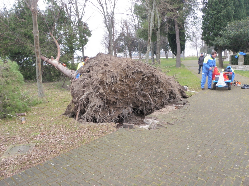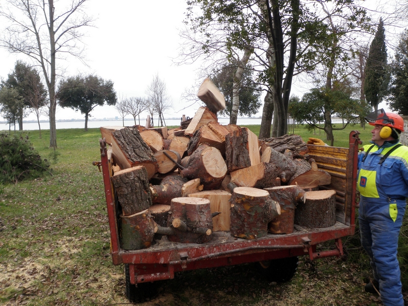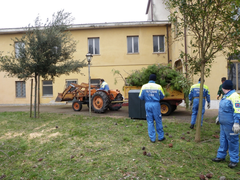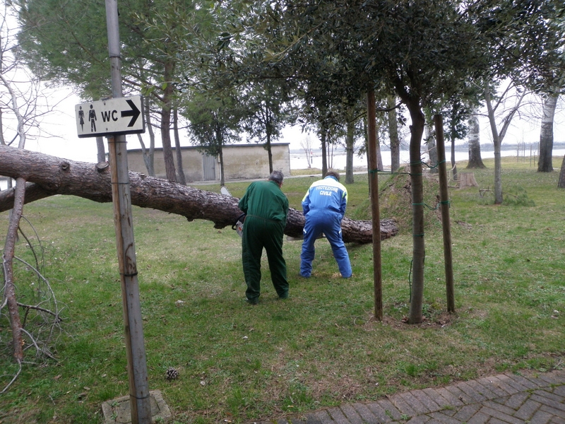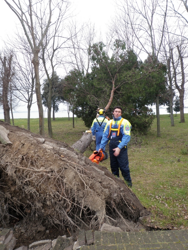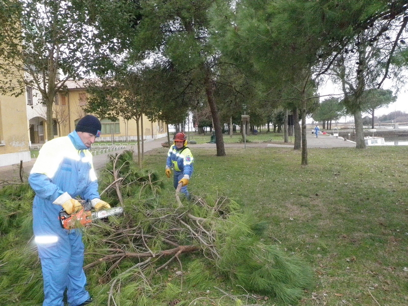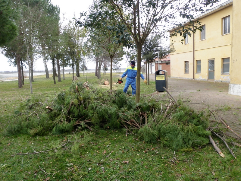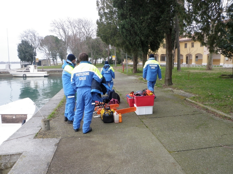 Ancora una volta, il comune privo di un presidio invernale dei Vigili del Fuoco, ha potuto contare sull'intervento della squadra stabile di intervento della locale protezione civile, che si è impegnata nella mattinata tuttavia con dotazioni manuali, come motoseghe di cui sono periodicamente addestrati e formati, e un piccolo mezzo meccanico, dovendo rinunciare a cestelli mobili e macchinari più complessi non trasportabili attraverso la laguna.