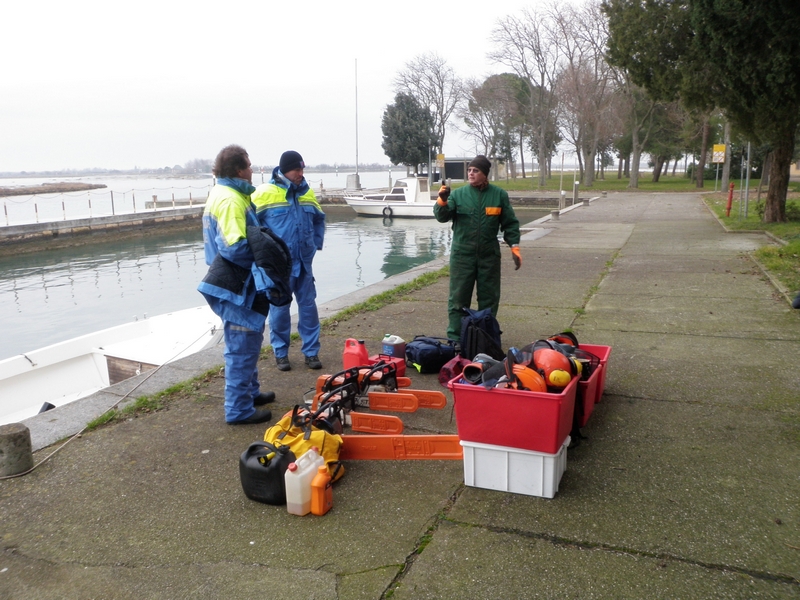 Dovendo trasportare attrazzature attraverso la laguna, la locale squadra ha dovuto limitare le attrazzature da taglio e asporto a quanto trasportabile con le barche in dotazione, comunque non esigue.
