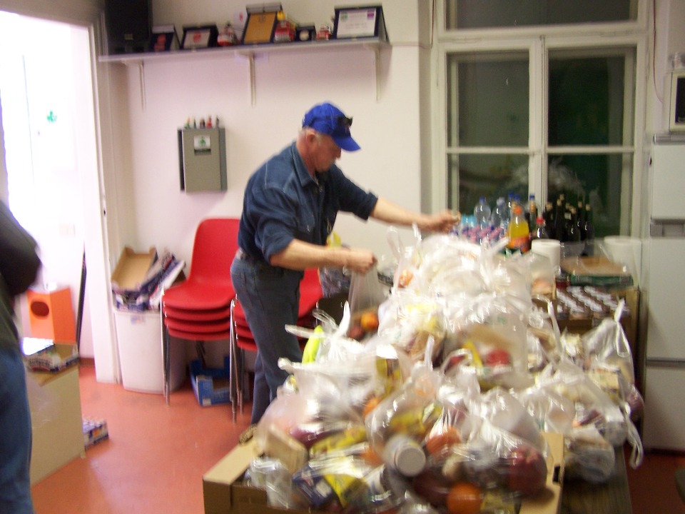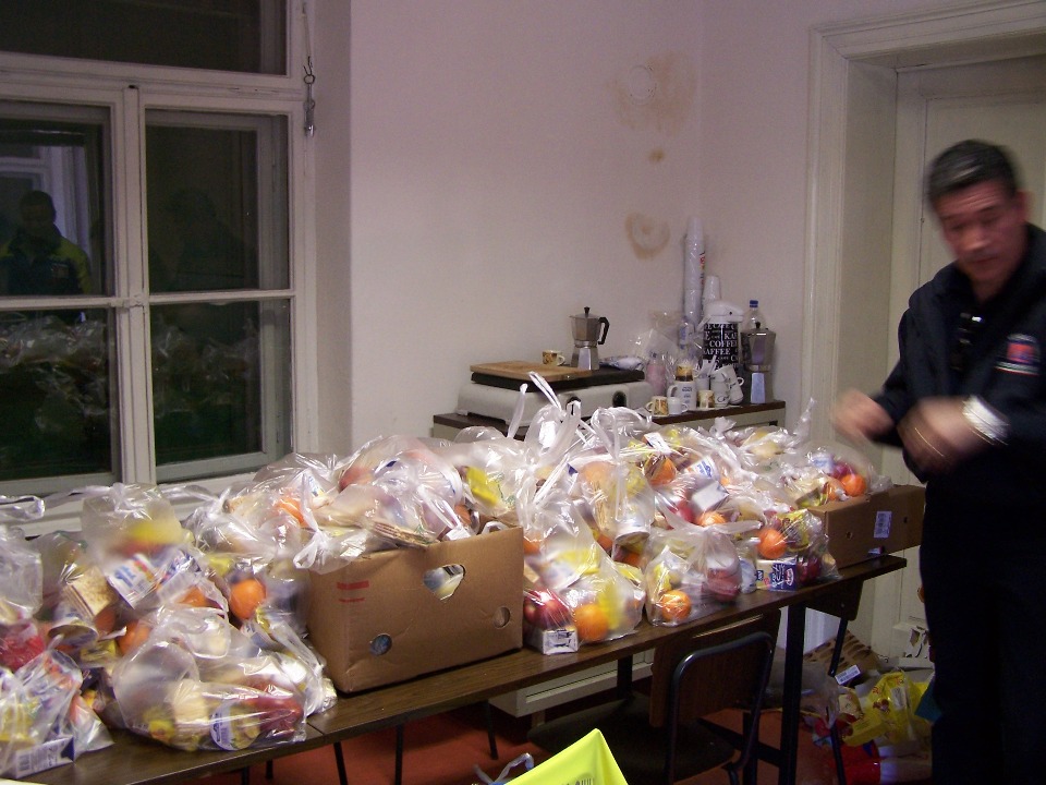 Nella mattinata i volontari hanno confezionato e distribuito 500 sacchetti viveri che sono stati poi distribuiti con due mezzi all'autoporto di Fernetti e al Porto Nuovo.