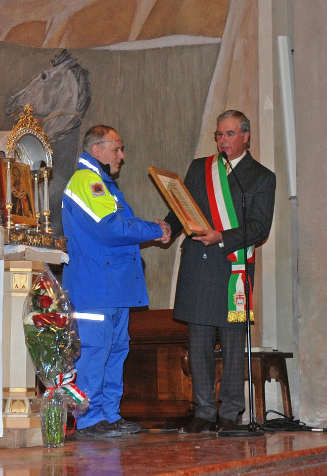 La premiazione si è svolta al termine della Santa Messa per il patrono svoltasi martedì 6 dicembre 2011. Il Sindaco ha ringraziato il gruppo per l’impegno che ogni volontario mette e per il tempo che dedica alla comunità senza avere nulla in cambio, se non la gratificazione personale di aver contribuito al bene comune. Ringraziamenti ai volontari sono venuti anche dal coordinatore Manfè Ezio che ha voluto ricordare che la Protezione civile è composta da persone che quando vengono chiamati per i motivi più disparati trovano sempre una soluzione nel limite delle possibilità; volontari che prima di tutto sono cittadini desiderosi di essere utili in senso concreto alla comunità. E’ stata ricordata anche la collaborazione con la Parrocchia nell'attività durante il Gr.est. che permette ai giovani e ai ragazzi di avvicinarsi consapevolmente al mondo del volontariato ed in particolare a quello della Protezione Civile.