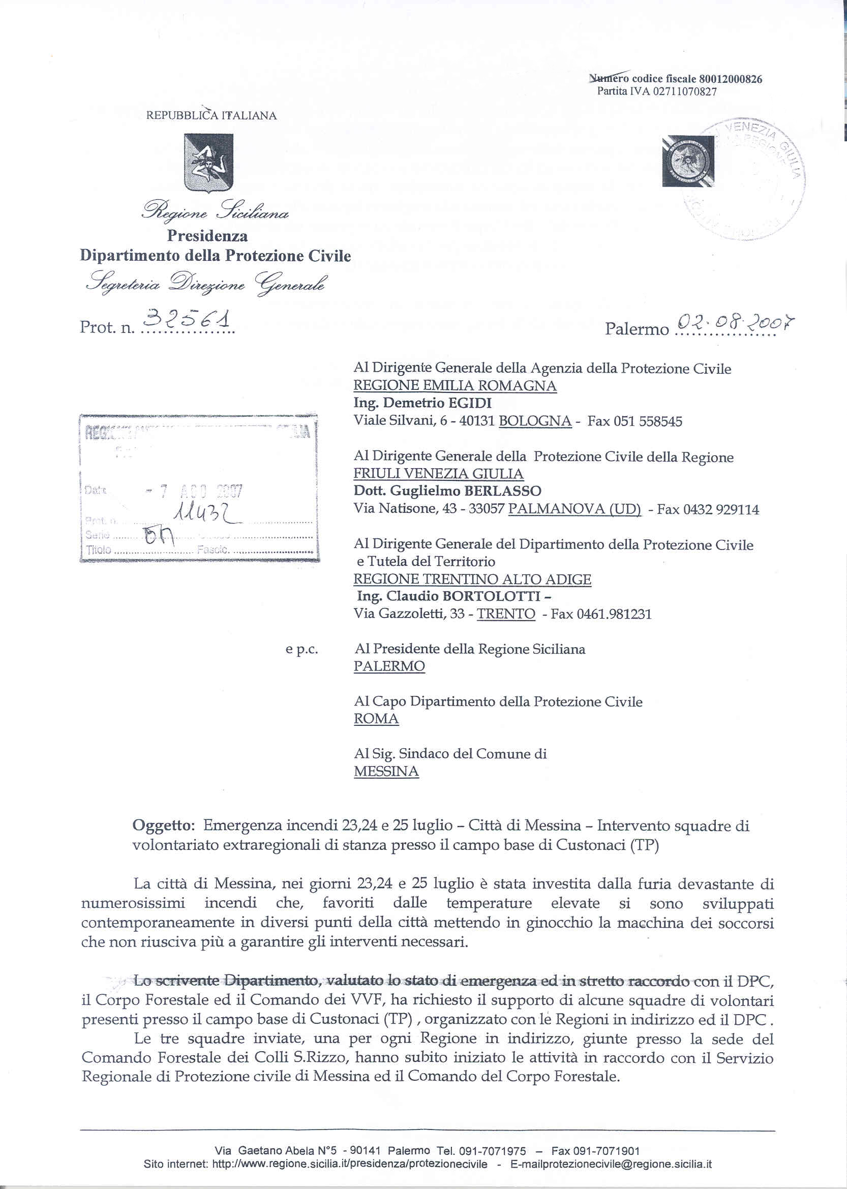 La Protezione civile della Regione Friuli Venezia Giulia ha ricevuto dal Dipartimento della Protezione civile della Regione Sicilia una lettera di encomio per il fondamentale contributo portato dalla squadra di volontari del Friuli Venezia Giulia, di stanza presso il campo base di Custonaci (TP), durante la grave emergenza incendi che ha colpito tutto il territorio siciliano dal 23 al 25 luglio 2007.