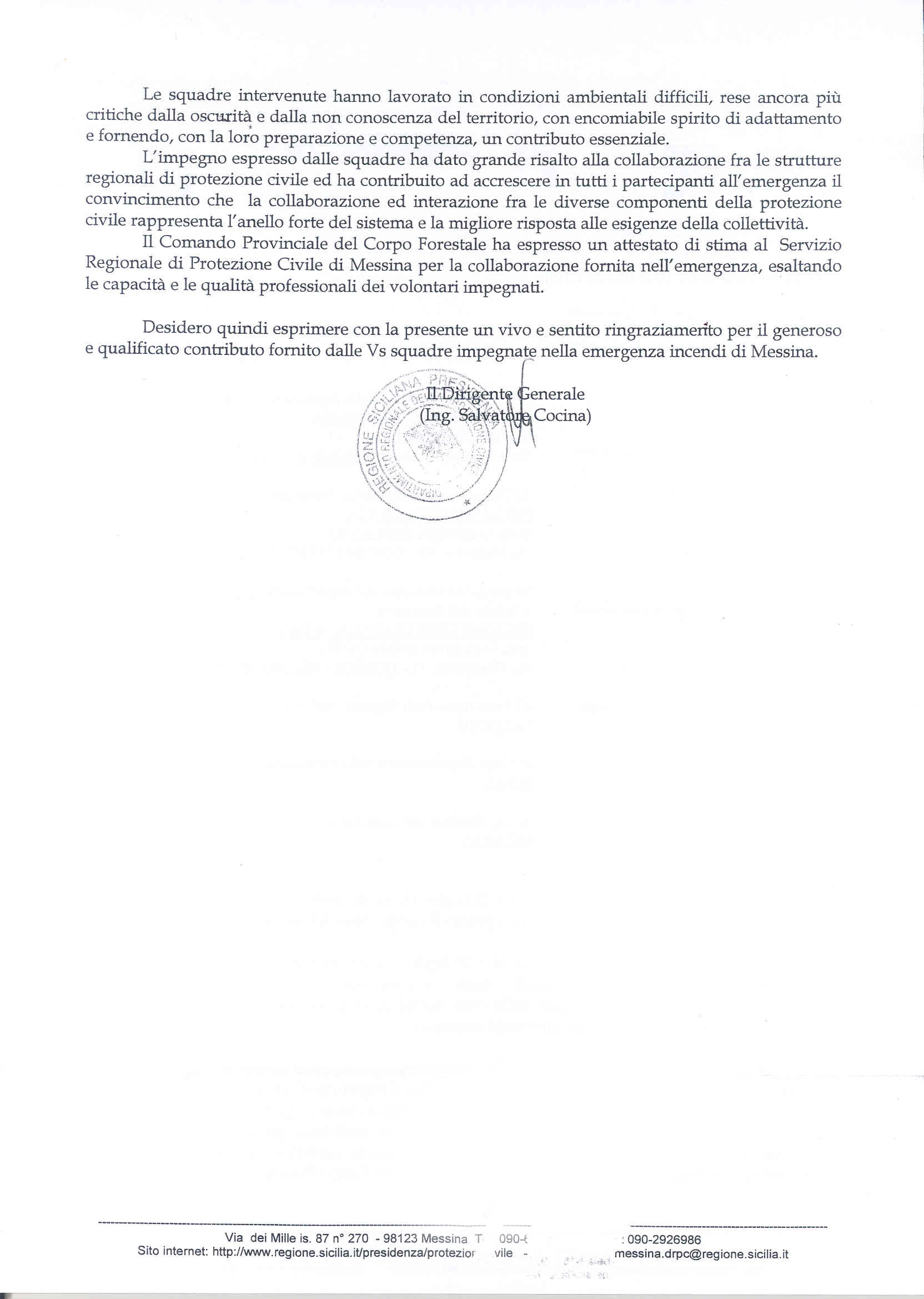 Lettera di encomio per i volontari del Friuli Venezia Giulia dal Dipartimento di Protezione civile della Regione Sicilia