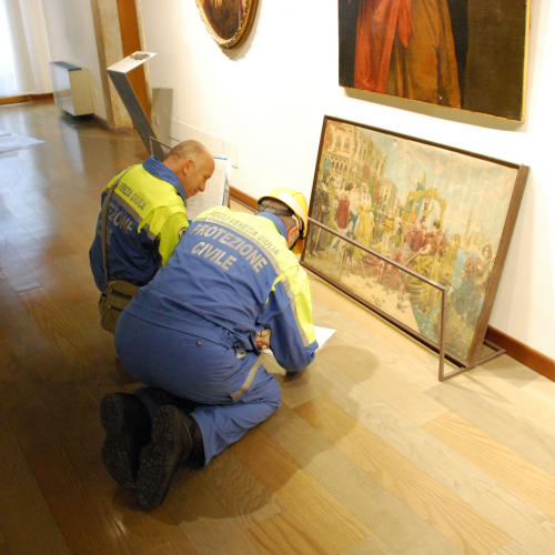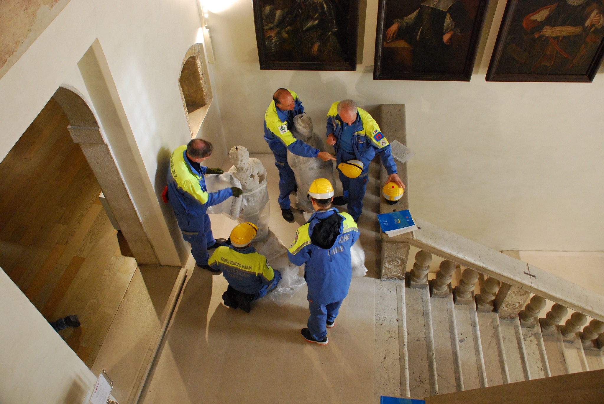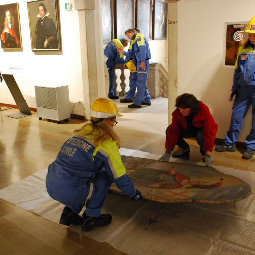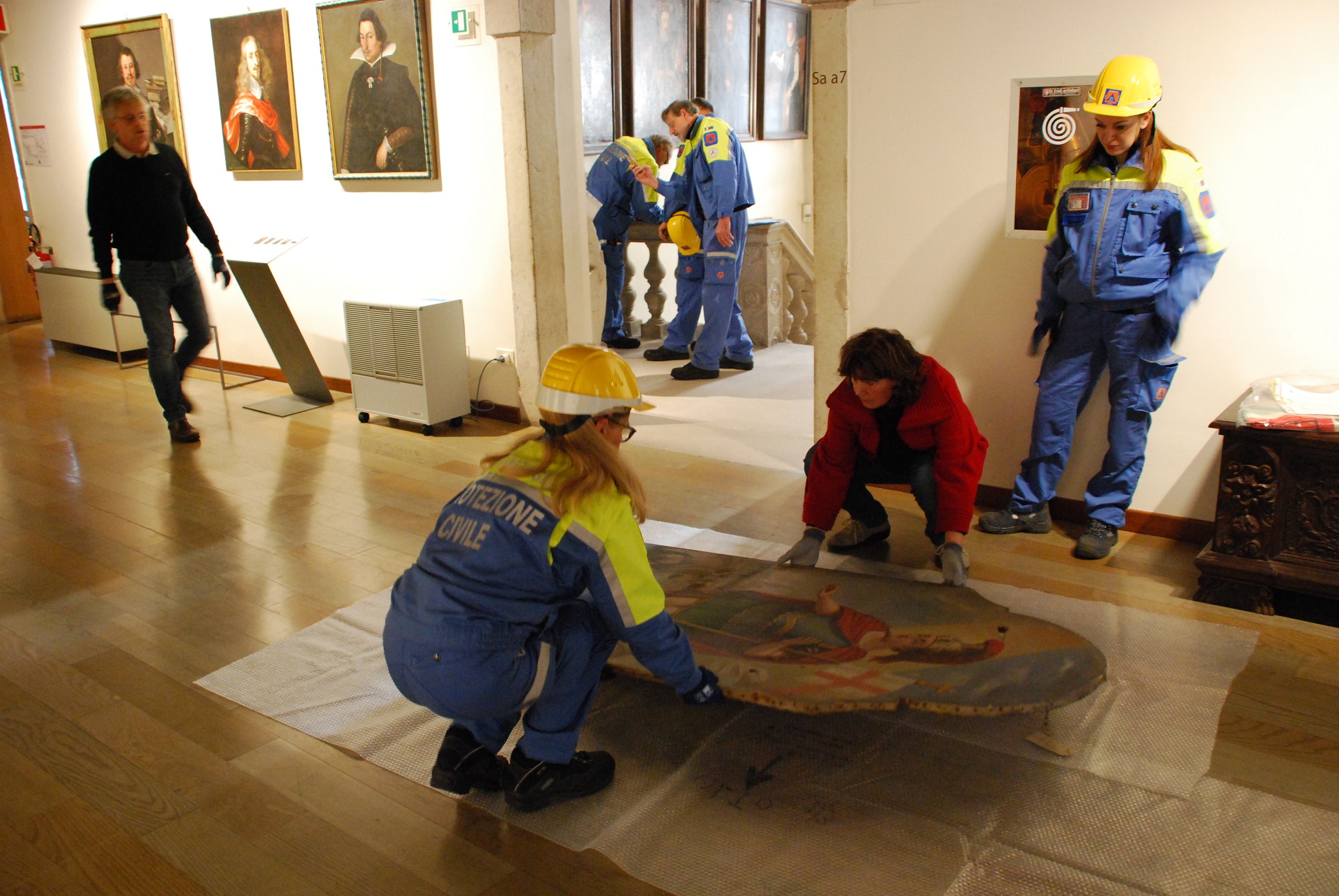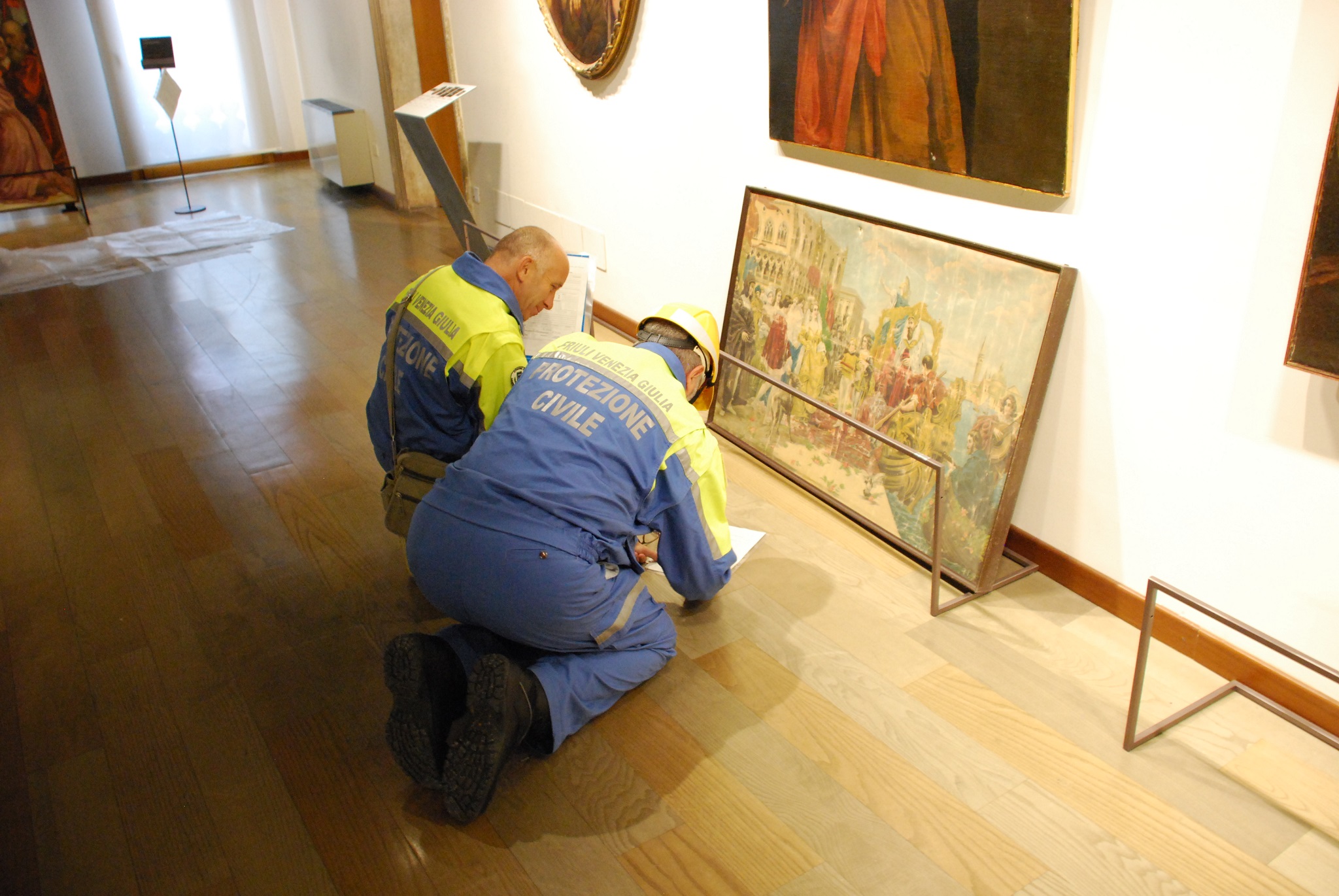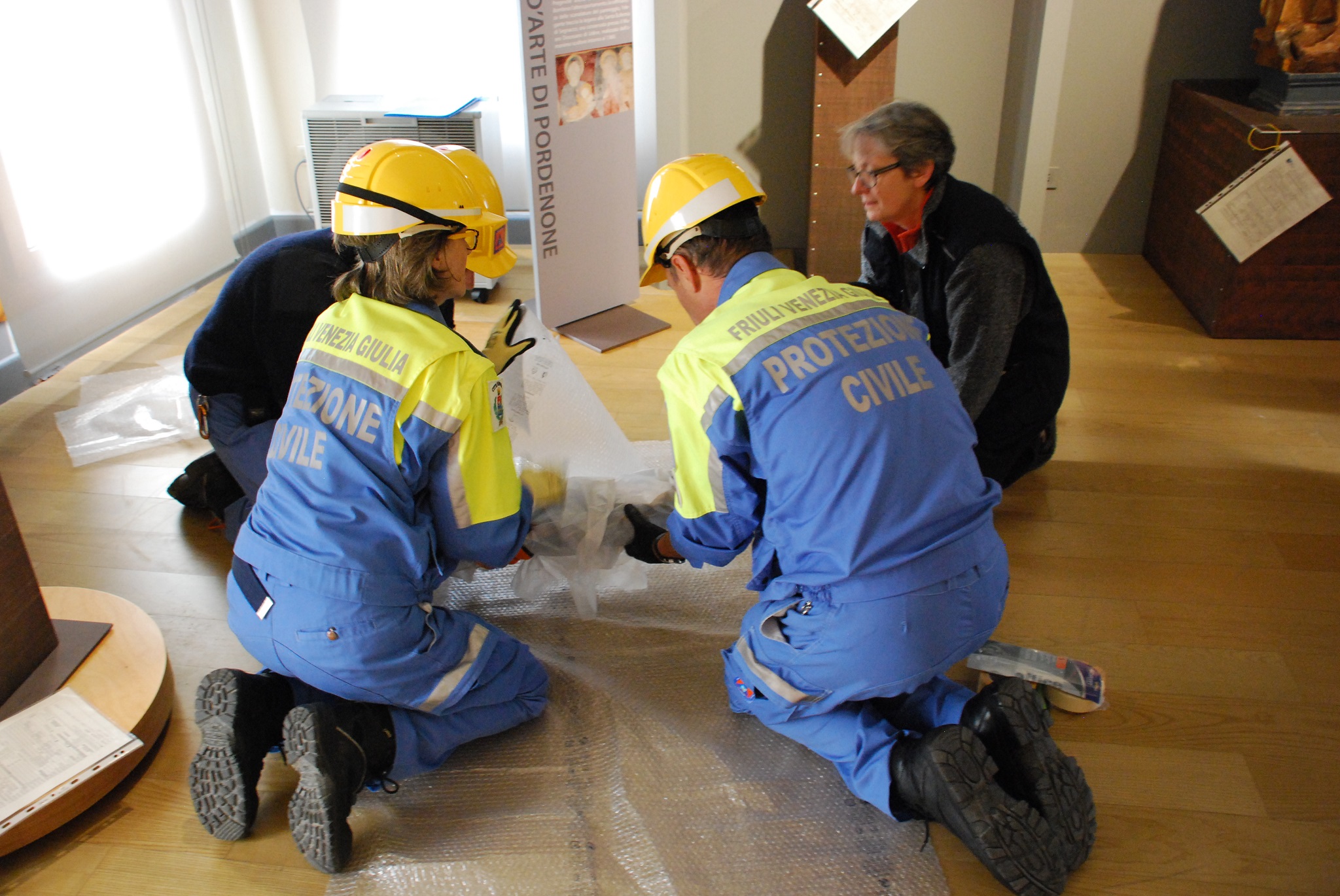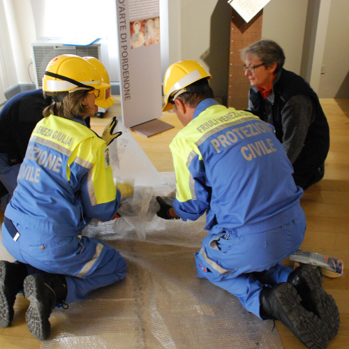 La parte pratica, che si è svolta sabato 28 ottobre, in mattinata ha avuto una location d’eccezione sia per la sua bellezza che per la sua tipologia: il Museo civico d’arte Ricchieri di Pordenone. Qui i corsisti, sotto la direzione e supervisione delle restauratrici/curatrici del museo e dei funzionari della Soprintendenza, hanno acquisito operando in un contesto reale quali sono gli strumenti, le metodologie e le tecniche per  trattare i beni culturali di tipo museale nel caso dovesse essere predisposta la loro messa in sicurezza a causa di un’emergenza. Sono stati simulati tutti i vari step dell’attività: dall' analisi della situazione dello stato di fatto di un bene, alla sua rimozione, alla compilazione della Scheda di accompagnamento del bene rimosso, all' imballaggio ai fini del trasporto ed infine alla rimessa in opera.