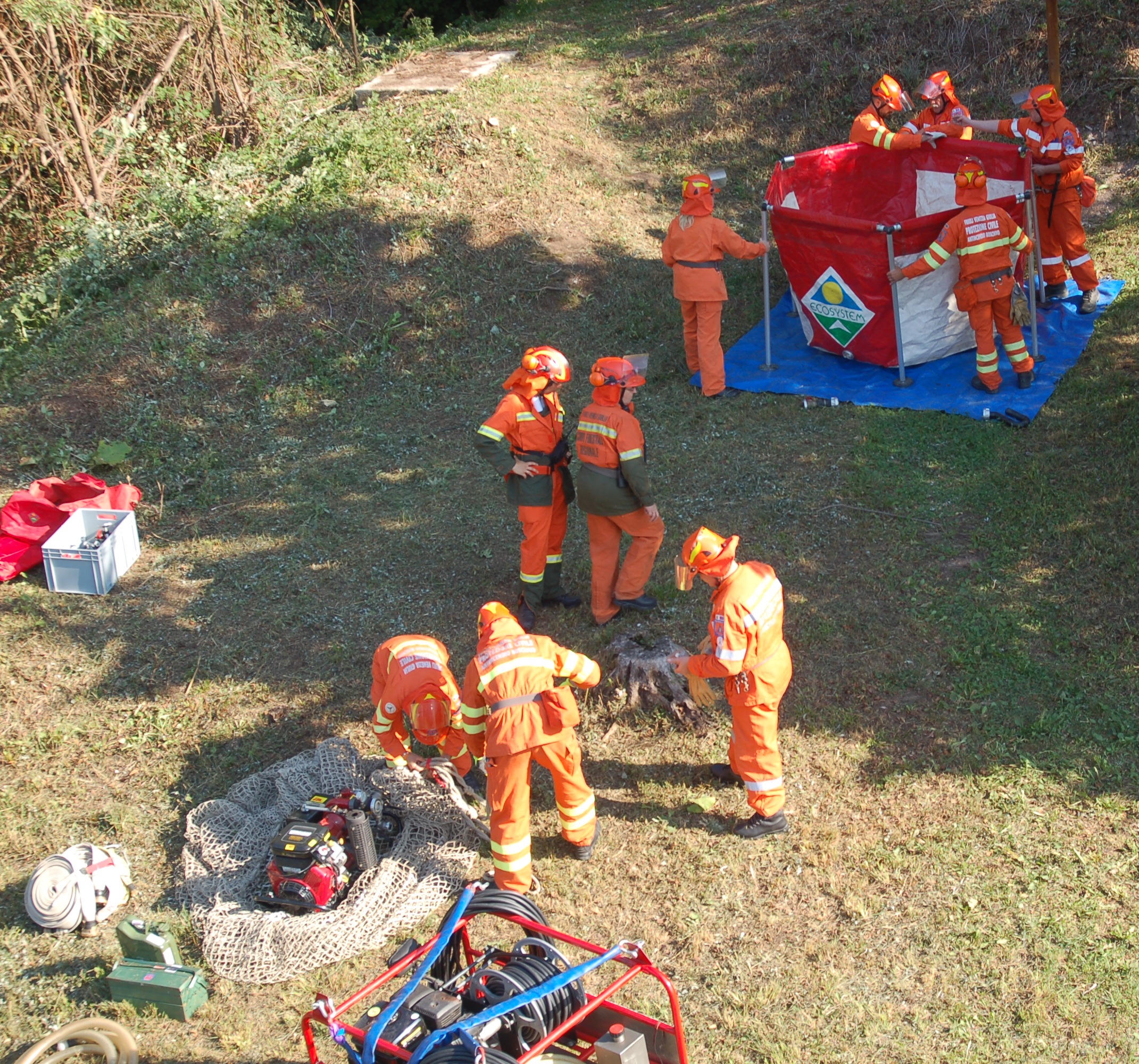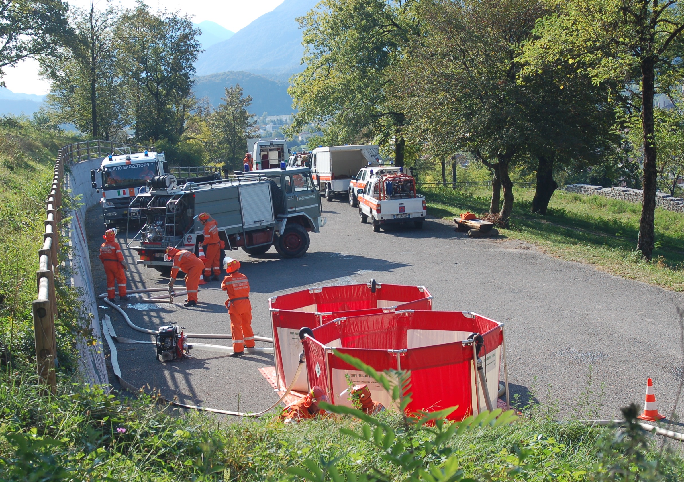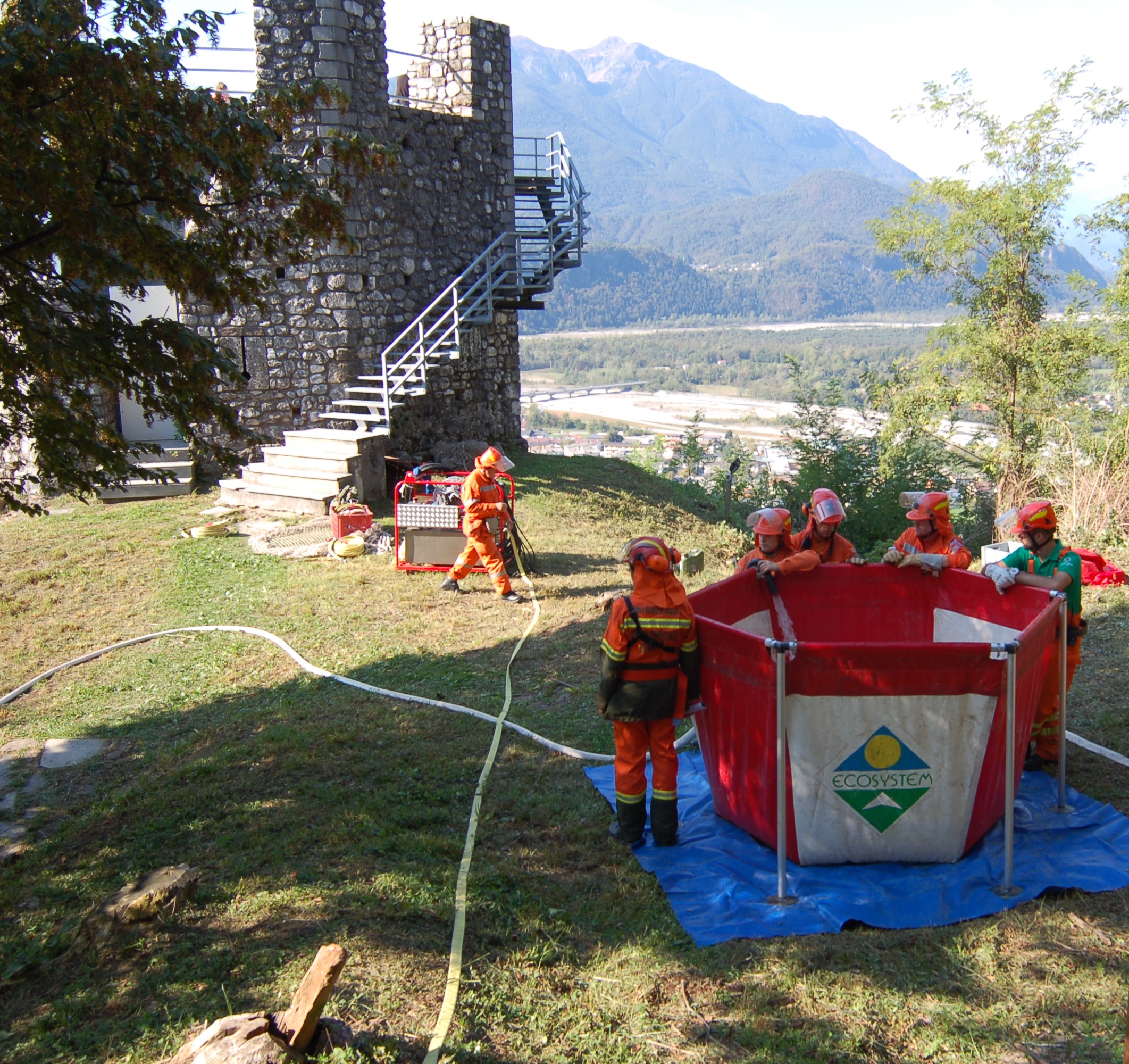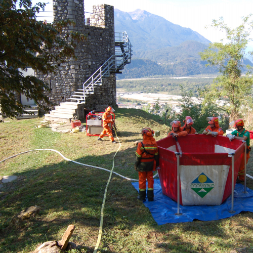 Le attività pratiche hanno visto il dispiegamento, presso il settore rifornimento idrico, di vasconi mobili per l’approvvigionamento idrico presso il piazzale di Prà Castello con il rifornimento da parte delle autobotti specifiche per l’antincendio boschivo dei Vigili del Fuoco (Unimog U20), del Corpo Forestale Regionale (un Iveco 80 e uno Scam 55) e della Protezione Civile del Gruppo Comunale di Cividale (un MB Atego) che hanno portato acqua, garantendo un rifornimento continuo senza lasciare la linea senz’acqua, facendo spola tra Prà Castello e il deposito interrato situato presso la Palestra di Roccia di Betania.
